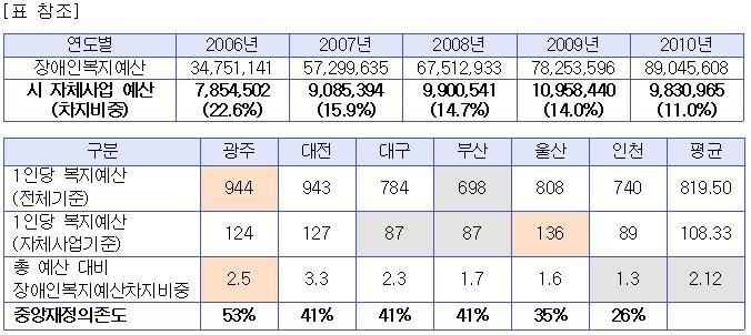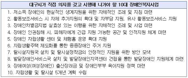❍ ´ë±¸½ÃÀÇ ÀÚüÀûÀÎ Àå¾ÖÀÎÀÚ¸³»ýȰ À¯µµ‧Áö¿øÁ¤Ã¥À¸·Î º¼ ¼ö ÀÖ´Â °ÍÀÌ Àå¾Ö¼ö´çƯº°Áö¿ø, Ȱµ¿º¸Á¶¼ºñ½ºÃß°¡Áö¿ø ÀÌ ¿Ü¿¡´Â ÇÑÁ¤ÀûÀÎ °ÍÀÌ »ç½ÇÀÓ. ❍ ´ë±¸½Ã°¡ ÁøÁ¤ ´ë±¸½Ã¿¡ °ÅÁÖÇÏ´Â Àå¾Ö¡®½Ã¹Î¡¯ÀÇ »îÀ» °í¹ÎÇÑ´Ù¸é, Áß¾ÓÁ¤ºÎ¿¡¼ ½ÃÇàÇÏÁö ¾Ê´Â Á¤Ã¥À̶ó ÇÏ´õ¶óµµ ¾Æ·¡¿Í °°Àº Á¤Ã¥µéÀ» Áö¹æÁ¤ºÎ¿¡¼ºÎÅÍ ÆîÃÄ ³ª°¡¾ß ÇÒ °ÍÀÓ.