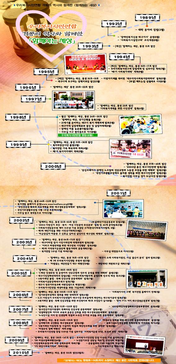 ¡¸¿ì¸®º¹Áö½Ã¹Î¿¬ÇÕ¡¹ °Ýµ¿ÀÇ ¿ª»ç¿Í ÇÔ²²ÇÑ ¡¸ÇÔ²²ÇÏ´Â ¼¼»ó¡¹ ÇÔ²²ÇÏ´Â ¼¼»óÀÌ 2010³â 3¿ù·Î 150È£¸¦ ¹ßÇàÇÏ°Ô µÇ¾ú½À´Ï´Ù. ±× µ¿¾È ¸¹Àº ¿ì¿©°îÀýµµ ÀÖ¾úÁö¸¸, ¿©·¯ºÐµéÀÇ Âü¿©¿Í µµ¿òÀ¸·Î 150È£¸¦ ¹ß°£ÇÏ¿© ÃàÇÏÇϱ⿡ À̸£·¶½À´Ï´Ù. ȸ¿ø¿©·¯ºÐ°ú ÁýÇÊÀÚ ¿©·¯ºÐ¿¡°Ô °¨»çµå¸³´Ï´Ù. ¿ì¸®º¹Áö½Ã¹Î¿¬ÇÕ °Ýµ¿ÀÇ ¿ª»ç¿Í ÇÔ²²ÇÑ¡¸ÇÔ²²ÇÏ´Â ¼¼»ó¡¹À» ÅëÇØ Áö³ ¿ª»ç¸¦ °£·«ÇÏ°Ô »ìÆì º¸¾Ò½À´Ï´Ù. ¡Ø¡¸ÇÔ²²ÇÏ´Â ¼¼»ó¡¹ ⸳ȣ~14È£±îÁö ¼ÒÀåÇÏ°í °è½Å ºÐÀº »ç¹«Ã³·Î ¿¬¶ô¹Ù¶ø´Ï´Ù.