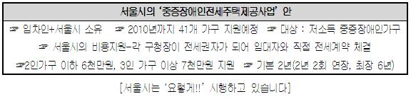 ÇÑÆí, ÇöÀç ¼¿ï½Ã¿¡¼´Â ÁÖ¸ñÇÒ ¸¸ÇÑ Á¤Ã¥À» ÆîÄ¡°í ÀÖ½À´Ï´Ù. ¡®ÁßÁõÀå¾ÖÀÎ Àü¼¼ÁÖÅà Á¦°ø»ç¾÷¡¯À̶ó´Â À̸§À¸·Î Àú¼Òµæ ÁßÁõÀå¾ÖÀο¡°Ô ÀÏÁ¤±â°£ ½Ã¿¡¼ Àü¼¼º¸Áõ±ÝÀ» Áö¿øÇÏ´Â, Áï ¹«»óÀ¸·Î ÁÖÅÃÀ» Á¦°øÇÏ´Â »ç¾÷À» ÆîÄ¡°í ÀÖ½À´Ï´Ù. ÀÌ´Â Àå¾ÖÀÎÀÇ ÁÖ°Å¿¡ ´ëÇÑ ¿¸Á°ú Ä¡¿ÇÑ ÅõÀïÀÇ °á°ú¶ó°í ÇÒ ¼öµµ ÀÖ°Ú½À´Ï´Ù. ^^