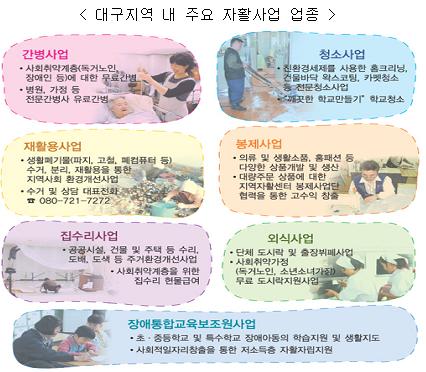ù°, ´ë±¸±¤¿ª½ÃÀÇ Àû±ØÀûÀÎ Áö¿øÃ¼°è ¸ð»öÀ» ÅëÇØ ÀÚȰ»ç¾÷ÀÌ ¾ÈÁ¤ÀûÀÎ ¼öÀͱ¸Á¶¸¦ °¡Á® °¥ ¼ö ÀÖµµ·Ï Áö¿øÇÑ´Ù. ´ë±¸½Ã¹ÎÀÇ »îÀÇ Áú Çâ»óÀ» À§ÇØ ¿î¿µµÇ°í ÀÖ´Â °ø°ø¼ºñ½º¿¡ ´ëÇÑ ¹Î°£(Áö¿ªÀÚȰ¼¾ÅÍ)À¸·ÎÀÇ À̾ç, °ø°ø±â°ü¿¡¼ ÁøÇàµÇ´Â ´Ù¾çÇÑ °ø°³°æÀïÀÔÂû¿¡¼ ÀÚȰÀÇ ¿ì¼±±Ç ºÎ¿©(ȤÀº °¡»êÁ¡ Á¦°ø)¿Í ÀÚȰ¿¡¼ »ý»êµÇ´Â À¯¡¤¹«ÇüÀÇ »ý»êǰ(¼ºñ½º)À» °ø°ø±â°üÀÌ Àû±ØÀûÀ¸·Î ±¸¸Å¡¤ÀÌ¿ëÇϵµ·Ï Àå·ÁÇÑ´Ù.