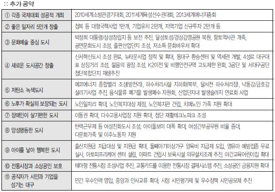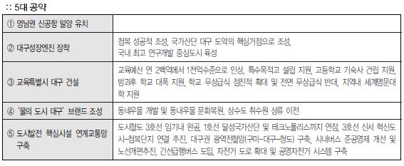 ±è¹üÀÏ ´ë±¸½ÃÀåÀÌ Á¦½ÃÇÑ °ø¾à Áß Æ¯È÷ ´«¿¡ ¶ç´Â ºÎºÐÀº ¼ºÀåÁß½ÉÀÇ °¢Á¾ °³¹ß°ø¾àÀÌ ¸¹´Ù´Â Á¡°ú Àü±¹ÀûÀ¸·Î À̽´ÈµÈ º¹Áö¿Í °ü·ÃÇÑ °ø¾àÀº Àú¼ÒµæÃþ À§ÁÖÀÇ ¼±º°ÀûÀ̰í ÀÜ¿©ÀûÀÌ¸ç ºñÀüÁ¶Â÷ ºÎÀçÇÏ´Ù´Â Á¡ÀÌ´Ù. ģȯ°æ ¹«»ó±Þ½Ä, ¹«»óº¸À°, º¹Áö¿¹»ê È®Ãæ, ºñÁ¤±ÔÁ÷ÀÇ Á¤±ÔÁ÷È µî ´ëºÎºÐÀÇ º¹Áö°ø¾àÀº ÀçÁ¤¿©°ÇÀ» °í·Á Á¡ÁøÀûÀ¸·Î ÃßÁøÇÏ°Ú´Ù°í ¹àÈù ¹Ý¸é °æÀïÀ» ¾Õ¼¼¿î ±³À°°ú ¿µ¸®º´¿ø µµÀÔÀº Àû±Ø Âù¼ºÇϰí ÀÖ´Ù. ¼±°Å±â°£ Áß ¹æ¼ÛÅä·Ðȸ¿¡¼ ¸»ÇÑ <´ë±¸½Ã ½É³úÇ÷°üÁúȯ °íÀ§Ç豺 µî·Ï°ü¸® ½Ã¹ü»ç¾÷>¿¡ ´ëÇÑ °ÅÁþÇØ¸í ¶ÇÇÑ ¼±°Å´Â ³¡³µÁö¸¸ ¿©ÀüÈ÷ Áø½Ç°ø¹æÀÌÀ̾îÁö°í ÀÖ´Ù(p.4 ÂüÁ¶).