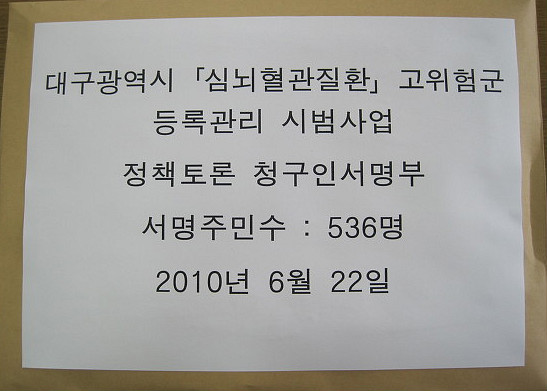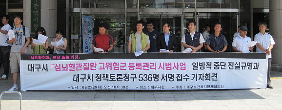 2010³â 6¿ù 22ÀÏ ´ë±¸½Ã ¡¸½É³úÇ÷°üÁúȯ °íÀ§Ç豺 µî·Ï°ü¸® ½Ã¹ü»ç¾÷¡¹ÀϹæÀû Áß´Ü ÀÇȤ ÇØ¸í°ú Á¤Ã¥Åä·Ðû±¸ ¼¸í Á¢¼ö ±âÀÚȸ°ß Âü°¡ÀÚ Àϵ¿