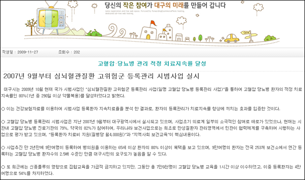 ¡ã '½É³úÇ÷°üÁúȯ °íÀ§Ç豺 µî·Ï°ü¸® ½Ã¹ü»ç¾÷'ÀÇ ¼º°ú¸¦ ¼³¸íÇÏ´Â ´ë±¸½Ã º¸µµÀÚ·á(2009.11.27) / »çÁø Ãâó. ´ë±¸½Ãû ȨÆäÀÌÁö