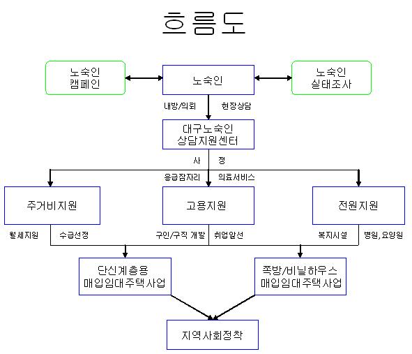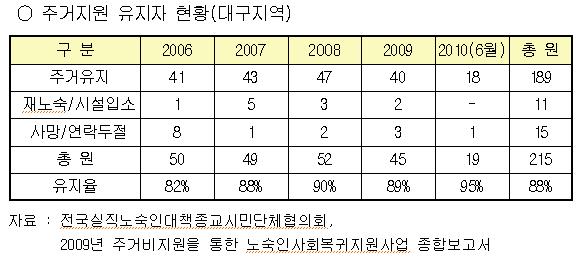 4. ÀÓ½ÃÁְźñ Áö¿øÀ» ÅëÇÑ ³ë¼÷ÀÎ »çȸº¹±Í »ç¾÷ÀÇ Á¦µµÈ ³ë¼÷À» ÇÏ´Â ºÐµé Áß¿¡ ¼ö±Þ¼±Á¤ ´ë»ó¿¡ Æ÷ÇԵǾ Áֹεî·ÏÀÌ ¸»¼ÒµÇ°Å³ª ÁÖ°ÅÁö°¡ ¾ø¾î¼ ¼ö±Þ½ÅûÀ» ÇÏÁö ¸øÇÏ´Â ºÐµé¿¡ ´ëÇÑ °í¹Î¿¡¼ ½ÃÀÛµÈ »ç¾÷ÀÌ´Ù. 2005³â ´ë±¸»çȸº¹Áö°øµ¿¸ð±Ýȸ »ç¾÷À¸·Î ¿ù¼¼Áö¿øÀ» ÅëÇØ¼ ÁÖ°ÅÁö¸¦ ¸¶·ÃÇÏ°í ¼ö±Þ½ÅûÀ» ÇÔÀ¸·Î½á µ¶¸³ÁְŰ¡ °¡´ÉÇϵµ·Ï ÁøÇàµÇ¾ú´Ù. 2005³â ÇÑ ÇØ µ¿¾È 97¸íÀ» Áö¿øÇÏ¿´°í 2006³â ¿©¸§¿¡ ÁÖ°ÅÁö¿øÀ» ¹ÞÀº ´ë»óÀÚ°¡ ¾î´À Á¤µµ ÁÖ°ÅÁö¸¦ À¯ÁöÇϰí ÀÖ´ÂÁö È®ÀÎÇÑ °á°ú 82%°¡ ÁÖ°ÅÁö¸¦ À¯ÁöÇϰí ÀÖ¾ú´Ù. ³ë¼÷Àο¡°Ôµµ ÁÖ°ÅÁö°¡ È®º¸µÇ°í »ýȰÀ» À¯ÁöÇÒ ¼ö ÀÖ´Â ÃÖ¼ÒÇÑÀÇ ¿©°Ç¸¸ Á¶¼ºµÇ¸é Àç³ë¼÷À» ÇÏÁö ¾Ê°í »ýȰÀ» À¯ÁöÇÒ ¼ö ÀÖ´Ù´Â °ÍÀ» º¸¿©ÁØ´Ù. ÀÌ¿¡ 2006³âºÎÅÍ Áö¿ª»ç¾÷¿¡¼ Àü±¹»ç¾÷À¸·Î È®´ëµÇ¾î 2009³â±îÁö Àü±¹ÀûÀ¸·Î 2,500¸í¿¡°Ô ÁÖ°ÅÁö¿øÀ» ÇÏ¿´´Ù.