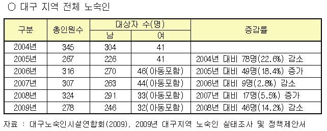 3. ³ë¼÷ÀÎ ´ëÇÑ Áß․Àå±âÀû Á¤Ã¥¸¶·ÃÀ» À§ÇÑ ½ÇÅÂÁ¶»ç ³ë¼÷Àο¡ ´ëÇÑ ½ÇÅÂÁ¶»ç°¡ ÀϺΠÁö¿ª¿¡¼ ÀÌ·ç¾îÁö°í ÀÖÀ¸³ª Á¤ºÎÂ÷¿ø¿¡¼ Àü±¹ ³ë¼÷ÀÎ ½ÇÅÂÁ¶»ç´Â ÀÌ·ç¾îÁø ÀûÀÌ ¾ø´Ù. Àü±¹ ³ë¼÷ÀÎÀÇ ½ÇŰ¡ ÆÄ¾ÇµÇ¾î¾ß Á¤Ã¥´ë»óÀÌ È®ÀÎµÇ°í ³ë¼÷ÀÎÀÇ ÇöȲÀ» ¹ÙÅÁÀ¸·Î ü°èÈµÈ Á¤Ã¥ÀÌ ¸¶·ÃµÉ ¼ö ÀÖ´Ù. ´ë±¸Áö¿ªÀº 2004³âºÎÅÍ Áö¿ªÀÇ ³ë¼÷°ü·Ã ´Üü¿Í ÁöÀÚüÀÇ Áö¿øÀ¸·Î ¸Å³â Á¶»ç°¡ ÀÌ·ç¾îÁö°í ÀÖÀ¸¸ç, ÇâÈÄ Áß․Àå±âÀû Á¤Ã¥¸¶·ÃÀ» À§ÇØ ¿ÃÇØ¡®´ë±¸±¤¿ª½Ã ³ë¼÷ÀÎ º¸È£¿¡ °üÇÑ Á¶·Ê¡¯¸¦ Á¦Á¤ÇÏ¿´´Ù. ÀÌ´Â Àü±¹¿¡¼ ÃÖÃÊ·Î ÀÌ·ç¾îÁø °ÍÀ¸·Î Áß¾ÓÁ¤ºÎ¿Í ÇÔ²² ÁöÀÚüµµ ³ë¼÷ÀÎ »ç¾÷¿¡ Àû±ØÀûÀ¸·Î Âü¿©ÇÏ´Â Å« Àǹ̸¦ °¡Áø´Ù. ¾Æ¿ï·¯ Àü±¹ÀûÀ¸·Î Á¶·ÊÁ¦Á¤ »Ó¸¸ ¾Æ´Ï¶ó ÀÔ¹ýÃßÁøÀÇ ¿òÁ÷ÀÓ±îÁö ÀÖ´Ù.