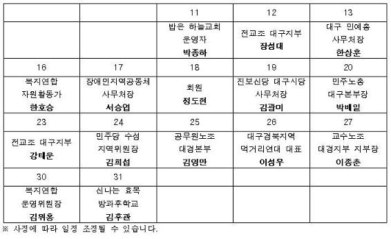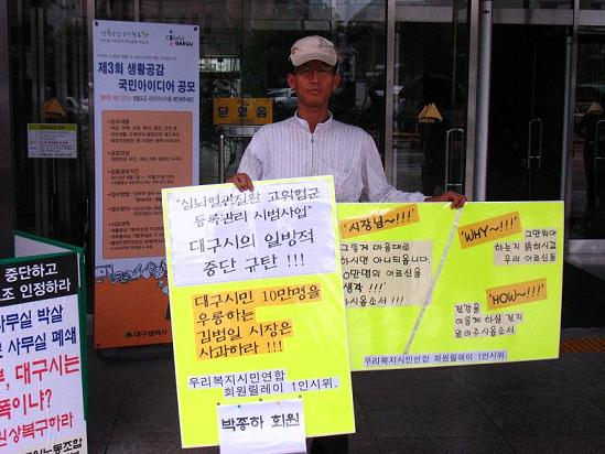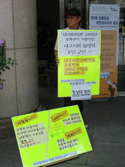 11ÀÏ ¹ÚÁ¾ÇÏ È¸¿øÀ» ½ÃÀÛÀ¸·Î 12ÀÏ À强´ë ȸ¿øÀÌ ÀÌ¹Ì 1ÀÎ ½ÃÀ§¿¡ Âü°¡ÇßÀ¸¸ç ¾ÕÀ¸·Îµµ ȸ¿øµéÀÇ ¸±·¹ÀÌ 1ÀÎ ½ÃÀ§°¡ ¸ÅÁÖ ¿ù¿äÀÏ¿¡¼ ±Ý¿äÀÏ Á¡½É½Ã°£¿¡ ÆîÃÄÁø´Ù. À̹ø ¡®¿ì¸®º¹Áö½Ã¹Î¿¬ÇÕ È¸¿ø ¸±·¹ÀÌ 1ÀÎ ½ÃÀ§'¿¡´Â ³ëµ¿, ½Ã¹Î»çȸ, º¹Áö, Á¤´ç µî ´Ù¾çÇÑ ¿µ¿ª¿¡¼ Ȱµ¿ ÁßÀÎ 15¸íÀÇ ¿ì¸®º¹Áö½Ã¹Î¿¬ÇÕ È¸¿øµéÀÌ Á÷Á¢ 1ÀνÃÀ§¿¡ Âü¿©ÇÏ°Ô µÈ´Ù. ÀÌ´Â »ç¹«Ã³ Áß½ÉÀÇ È°µ¿¿¡¼ ¹þ¾î³ª ¿ì¸®º¹Áö½Ã¹Î¿¬ÇÕ È¸¿øµéÀÌ Á÷Á¢ ½Ã¹ÎÇൿ¿¡ ³ª¼´Â ù ¹øÂ° »ç·Ê¶ó´Â Á¡¿¡¼ ´ë´ÜÈ÷ Àǹ̰¡ Å©´Ù. ¶ÇÇÑ À̹ø 1ÀνÃÀ§¸¦ ÅëÇØ °íÇ÷¾Ð¤ý´ç´¢ µî ¸¸¼ºÁúȯ°ü¸® »ç¾÷ÀÇ Á߿伺À» ½Ã¹Î»çȸ¿¡ È®»ê½ÃŰ´Â ÇÑÆí 10¸¸¸íÀ̳ª µî·ÏÇÑ ÀÌ »ç¾÷À» ÀϹæÀûÀ¸·Î Áß´ÜÇÏ°í¼µµ Áß¾ÓÁ¤ºÎÀÇ Å¿À¸·Î µ¹¸®°í ÀÖ´Â ´ë±¸½ÃÀåÀÇ ´ë½Ã¹Î »ç°ú¿Í ´ë¾ÈÀ» ¹Þ¾Æ³»±â À§Çؼ´Ù. ÀÌ¿Í ´õºÒ¾î 566¸íÀÇ ´ë±¸½Ã¹ÎÀÇ ¼¸íÀ» ¹Þ¾Æ û±¸ÇÑ ½Ã¹ÎÁ¤Ã¥Åä·Ðȸ´Â 8¿ù25ÀÏ ´ë±¸¹®È¿¹¼úȸ°ü ´Þ±¸¹ú Ȧ¿¡¼ ¿ÀÈÄ7½Ã °³ÃֵȴÙ. ´ë±¸½Ã°¡ ÀϹæÀûÀ¸·Î ÀÌ »ç¾÷À» Áß´ÜÇÑ ¿øÀÎÀº ¹«¾ùÀ̰í, »çÈÄ´ëÃ¥Àº ÀÖ´ÂÁö, ±×¸®°í U-Çコ ¿ø°Ý»ç¾÷°úÀÇ °ü°è µîÀ» ÁýÁß Á¶¸íÇÒ ¿¹Á¤ÀÌ´Ù. ÇÑÆí, ´ë±¸½Ã ½É³úÇ÷°üÁúȯ °íÀ§Ç豺 µî·Ï°ü¸® ½Ã¹ü»ç¾÷Àº 2007³â º¸°Çº¹ÁöºÎ·ÎºÎÅÍ ½Ã¹ü»ç¾÷Áö¿ªÀ¸·Î ÁöÁ¤¹ÞÀº ÀÌÈÄ ±×ÇØ 9¿ùºÎÅÍ ½ÃÀ۵Ǿî 65¼¼ÀÌ»ó 10¸¸¸íÀÌ»ó µî·ÏÇÏ¿´À¸³ª 2010³â 8¿ù¸»·Î Ä¡·áºñ¿Í ¾àÁ¦ºñ¸¦ Áß´ÜŰ·Î ÇØ ±×µ¿¾È ½Ã¹Î»çȸ·ÎºÎÅÍ ºñ³À» ¹Þ¾Æ ¿Ô´Ù.