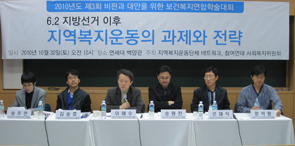 Á¦3ȸ ºñÆÇ°ú ´ë¾ÈÀ» À§ÇÑ º¸°Çº¹Áö¿¬ÇÕÇмú´ëȸ ÁغñÀ§ ÁÖÃÖ ¡®6.2Áö¹æ¼±°Å ÀÌÈÄ Áö¿ªº¹Áö¿îµ¿ÀÇ °úÁ¦¿Í Àü·«¡¯À̶ó´Â ÁÖÁ¦ Åä·Ðȸ°¡ 10¿ù30ÀÏ ¿ÀÀü10½Ã ¿¬¼¼´ëÇб³ ¹é¾ç°ü¿¡¼ °³ÃֵǾú´Ù.