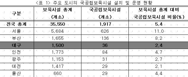 2009³â º¸À°Åë°è¿¡ µû¸£¸é ´ë±¸±¤¿ª½ÃÀÇ ±¹°ø¸³º¸À°½Ã¼³Àº ÃÑ 36°³¼Ò·Î Áö¿ª ³»ÀÇ Àüü º¸À°½Ã¼³ Áß ±¹°ø¸³º¸À°½Ã¼³ÀÌ Â÷ÁöÇÏ´Â ºñÀ²ÀÌ 2.4%¿¡ ºÒ°úÇÏ´Ù. ÀÌ´Â Àü±¹ Æò±ÕÀÎ 5.4%¿¡ Å©°Ô ¸ø ¹ÌÄ¡´Â ¼öÁØÀ¸·Î ´ëÀü±¤¿ª½ÃÀÇ µÚ¸¦ À̾î Àü±¹ ÃÖÇÏÀ§ÀÌ´Ù.