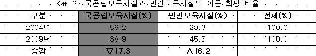 Àü±¹ÀûÀ¸·Î °¡Á¤º¸À°½Ã¼³°ú ¹Î°£º¸À°½Ã¼³ÀÌ Àüü º¸À°½Ã¼³ÀÇ ´ëºÎºÐÀ» Â÷ÁöÇϰí ÀÖ¾î º¸À°¼ºñ½ºÀÇ ¹Î°£ÀÇÁ¸µµ°¡ ¸Å¿ì ³ô°í, ±¹°ø¸³º¸À°½Ã¼³ 10°³¼Ò Áß ¾à 9°³¼Ò(87.6%)¿¡ ´ë±âÀÚ°¡ ÀÖ´Â ½ÇÁ¤¿¡¼ ±¹°ø¸³º¸À°½Ã¼³ÀÇ È®ÃæÀº ÇʼöÀûÀÌ´Ù. ƯÈ÷ ´ë±¸±¤¿ª½Ã´Â ¾Õ¼ »ìÆìº» °Íó·³ Ÿ º¸À°½Ã¼³ ´ëºñ ±¹°ø¸³º¸À°½Ã¼³ÀÇ ºñÀ²ÀÌ ÇöÀúÈ÷ ³·À¸¹Ç·Î ±¹°ø¸³º¸À°½Ã¼³ÀÇ ¾çÀû È®ÃæÀ» ¼±°áÇØ¾ß ÇÑ´Ù.