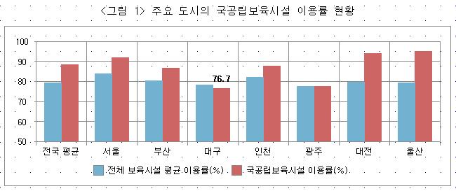 ¶ÇÇÑ ´ë±¸½ÃÀÇ ±¹°ø¸³º¸À°½Ã¼³Àº ½Ã¼³ ³»ÀûÀ¸·Îµµ ¹®Á¦Á¡À» °¡Áö°í ÀÖ´Ù. Àü±¹ ±¹°ø¸³º¸À°½Ã¼³ÀÇ Æò±Õ ÀÌ¿ë·üÀº 90%¿¡ À°¹ÚÇÏÁö¸¸ ´ë±¸±¤¿ª½ÃÀÇ °æ¿ì, 76.7%¿¡ ±×ÃÆÀ¸¸ç ÀÌ´Â Áö¿ª ³» º¸À°½Ã¼³ÀÇ Æò±Õ ÀÌ¿ë·üÀÎ 78.4%¿¡µµ ¹ÌÄ¡Áö ¸øÇÏ´Â ¼öÁØÀÌ´Ù. Áï, ´ë±¸½ÃÀÇ ±¹°ø¸³º¸À°½Ã¼³Àº ¾çÀû․ÁúÀû ¹®Á¦¸¦ µ¿½Ã¿¡ °¡Áö°í ÀÖ´Ù.
