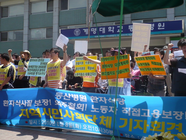 6. ȯÀÚ½Ä´ç µ·¹úÀÌ ¼ö´ÜÀΰ¡? ȯÀÚ Ä¡·á½ÄÀΰ¡? °è¸í´ë µ¿»êº´¿ø ȯÀڽĴçÀÇ ´Ù´Ü°è ¿ÜÁÖ·Î ÃË¹ßµÈ È¯ÀڽĻç ÀúÇÏ¿Í °£Á¢°í¿ë ¹®Á¦´Â 7°³¿ùÀÌ Áö³µÁö¸¸ ¿©ÀüÈ÷ ÇØ°áµÇÁö ¾ÊÀº ä ȯÀڽĴç Á÷Á¢¿î¿µ°ú º¹Á÷À» ¿ä±¸ÇÏ´Â ³ëµ¿Á¶ÇÕ°ú °¥µîÀ» ºúÀ¸¸é¼ Àå±âȵǰí ÀÖ´Ù. ¹Ý¸é, °æºÏ´ëº´¿øÀº Ä¥°îº´¿ø ¿ÜÁÖÈ ¹Ý´ë¿¡ ´ëÇØ Ä¥°îº´¿ø ȯÀÚ½Ä´ç ¿ÜÁÖ¾÷ü¿Í °è¾àÀÌ ³¡³ª¸é Á÷Á¢ ¿î¿µÇÑ´Ù´Â ÇÕÀǸ¦ ³ëµ¿Á¶ÇÕ°ú ÇØ ´ëÁ¶¸¦ º¸¿´´Ù. Áö³ 5¿ù31ÀÏ µ¿»êº´¿øÀº ȯÀڽĴçÀ» Ç®¹«¿øÀ¸·Î, Ç®¹«¿øÀº À¯´ÏÅ佺¶ó´Â Àη¾÷ü¿¡ ÀçÇÏûÁÖ¸é¼ ÃÖÀúÀÓ±ÝÀ» °¿äÇÏÀÚ ÀÌ¿¡ Ç×ÀÇÇÑ È¯ÀÚ½Ä´ç ³ëµ¿ÀÚµéÀ» Àü¿øÇذíÇÑ »óÅ´Ù. ´ë±¸Áö¿ª ´ëÇк´¿ø¿¡¼ À¯ÀÏÇÏ°Ô È¯ÀڽĴçÀ» ´Ù´Ü°è ¿ÜÁÖ ÇÏûÀ¸·Î ¿î¿µÇϰí ÀÖ´Â µ¿»êº´¿øÀº ÀÔ¿øÈ¯ÀÚ Çѳ¢ ½Ä´ë 5,190¿ø Áß 1,690¿øÀ», 900º´»ó ±âÁØÀ¸·Î º¸¸é ÇÏ·ç ¾à 450¸¸¿øÀ» ȯÀÚ½Ä´ç ¿ÜÁÖ·Î °¡¸¸È÷ ¾É¾Æ¼ ì±â´Â ²ÃÀÌ´Ù. ÀÌ »ç°ÇÀº ´ëÇк´¿øµéÀÌ ¿ÜÁÖÈ µîÀ» ÅëÇØ ÀÕ¼Ó Ã¬±â±â¿¡¸¸ Ç÷¾ÈÀÌ µÅ ÀÖ´Ù´Â ÁöÀûÀ» ¹Þ°í ÀÖ´Ù.