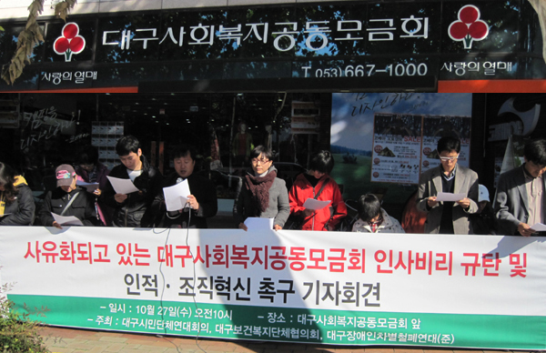 <2010³â ´ë±¸Áö¿ª »çȸº¹Áö 10´ë ´º½ºÀÇ 1À§¸¦ Â÷ÁöÇÑ '»çȸº¹Áö°øµ¿¸ð±Ýȸ ºñ¸®»ç°Ç'°ü·Ã ±âÀÚȸ°ß> ¶Ç, °Ñµ¹°í ÀÖ´Â 'µû¶æÇÑ ´ë±¸º¹Áö' Á¤Ã¥À» ºñ·ÔÇØ °è¸í´ë µ¿»êº´¿øÀÇ È¯ÀÚ½Ä´ç ¿ÜÁÖ ¹®Á¦¿Í ´ë±¸Àû½ÊÀÚº´¿ø Æó¿ø, ¹«³ÊÁø ÀÀ±ÞÀÇ·áü°è ¶§¹®¿¡ ÈÞÀÏ ´ëÇк´¿øÀ» ÀüÀüÇÏ´Ù 4¼¼ ¾î¸°À̰¡ ¼ûÁø »ç°Ç, ´ë±¸½ÃÀÇ '½É³úÇ÷°üÁúȯ °íÀ§Ç豺 µî·Ï°ü¸® ½Ã¹ü»ç¾÷' Áß´Ü, Á¤½Åº´¿ø¿¡¼ ¹ß»ýÇÑ Àå¾ÖÀÎ ¼ºÆø·Â »ç°Ç, Æ÷Ç× ³ëÀοä¾ç¿ø ÈÀç »ç°Çµµ ¿ÃÇØ ÁÖ¿ä º¹Áö´º½º·Î ²ÅÇû´Ù. ´ë±¸Áö¿ª ½Ã¹Î´ÜüÀÎ '¿ì¸®º¹Áö½Ã¹Î¿¬ÇÕ'Àº ÀÌµé »ç°ÇÀ» ºñ·ÔÇÑ '2010³â »çȸº¹Áö 10´ë ´º½º'¸¦ 22ÀÏ ¹ßÇ¥Çß´Ù. '10´ë ´º½º'´Â ÀÌ ´Üü »ç¹«Ã³°¡ 10°¡Áö ÁÖ¿ä ´º½º¸¦ »ÌÀº µÚ ȸ¿ø ¼³¹®Á¶»ç(ÀÀ´ä 32¸í)¸¦ °ÅÃÄ ¿ì¼± ¼øÀ§¸¦ °áÁ¤Çß´Ù°í ¹àÇû´Ù. ¿ÃÇØ 'ÃÖ°í º¹Áö´º½º'ÀÇ ºÒ¸í¿¹´Â '»çȸº¹Áö°øµ¿¸ð±Ýȸ'°¡ Â÷ÁöÇß´Ù. Áö³ 10¿ù ±¹Á¤°¨»ç¿Í 11¿ù º¸°Çº¹ÁöºÎ °¨»ç °á°ú, »çȸº¹Áö°øµ¿¸ð±Ýȸ Á÷¿øµéÀÌ ¾÷¹«¿Í »ó°ü¾øÀÌ À¯ÈïÁÖÁ¡°ú ³ë·¡¹æ ºñ¿ë µîÀ¸·Î 2,000¸¸¿øÀÌ ³Ñ´Â µ·À» ¾´ °ÍÀ» ºñ·ÔÇØ ±â±Ý »ç¿ë°ú Á÷¿ø °øÃ¤¿¡¼ ¸¹Àº ºñ¸®°¡ µå·¯³µ´Ù. ÀÌ·± ºñ¸®´Â Àü±¹Àû Çö»óÀ¸·Î, ´ë±¸Áöȸµµ ¿¹»êÀ» °ú´Ù.Æí¹ý ÁýÇàÇϰųª ÀÎ»ç ºñ¸®¸¦ ÀúÁö¸¥ °ÍÀ¸·Î ¹àÇôÁ³´Ù. 2010³â ´ë±¸Áö¿ª »çȸº¹Áö 10´ë ´º½º
