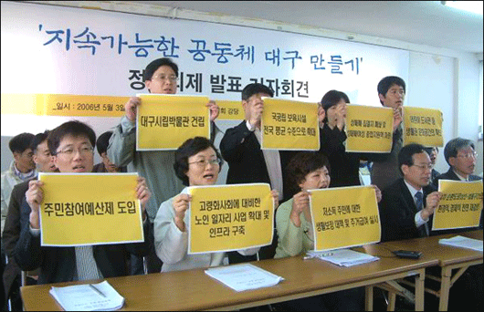 [5.31Áö¹æ¼±°Å] ´ë±¸ 16°³ ´Üü, ¡®À¯±ÇÀÚ´ëȸ¡¯¿¡¼ °áÁ¤ÇÑ 10´ë ÇٽɰúÁ¦ ¹ßÇ¥ "¾î¸°ÀÌ µµ¼°ü, ÁÖ¹ÎÂü¿©¿¹»êÁ¦, ¾Õ»êÅͳΠÀü¸é Àç°ËÅ䡱... ¡°¾ð·Ð °ü½É Á»..¡± ºÎŹ "ÁÖ¹ÎÀÇ »îÀÇ Áú°ú ¹ÐÁ¢ÇÑ 10´ë ÇٽɰúÁ¦¸¦ À¯±ÇÀÚ´ëȸ¸¦ °ÅÃÄ È®Á¤Çß½À´Ï´Ù¡° ´ë±¸Áö¿ª 16°³ ½Ã¹Î´Üü·Î ±¸¼ºµÈ [2006Áö¹æ¼±°Å ´ë±¸½Ã¹Î¿¬´ë]´Â ¿À´Ã(5.3) ¿ÀÀü ´ë±¸¿©¼ºÈ¸ °´ç¿¡¼ ±âÀÚȸ°ßÀ» °®°í, ¾îÁ¦(5.2) ¡®À¯±ÇÀÚ´ëȸ¡¯¸¦ ÅëÇØ È®Á¤ÇÑ ¡®Áö¼Ó°¡´ÉÇÑ °øµ¿Ã¼ ´ë±¸¸¸µé±â¡¯ 10´ë ÇٽɰúÁ¦¿Í ºÐ¾ßº° 27´ë Á¤Ã¥°úÁ¦¸¦ ¹ßÇ¥Çß´Ù. ´ë±¸½Ã¹Î¿¬´ë´Â ÀÌµé °úÁ¦¸¦ ¿À´Ã ¾È¿¡ ´ë±¸½ÃÀå ¿¹ºñÈĺ¸ 6¸íÀ» Á÷Á¢ ã¾Æ°¡ Àü´ÞÇÏ´Â ÇÑÆí, ¿À´Â 5¿ù 10ÀϱîÁö °¢ Èĺ¸µé¿¡°Ô ´äº¯À» ¹Þ¾Æ 23ÀÏÂë À̸¦ Á¾ÇÕÇØ ¹ßÇ¥Çϱâ·Î Çß´Ù. ÀÌµé ´Üü´Â ±âÀÚȸ°ß¿¡¼ ¡°ÁÖ¹ÎÀÇ »î°ú Áú°ú ¹ÐÁ¢ÇÑ ¢ºÁÖ¹ÎÀÚÄ¡ ¢ºµµ½Ãȯ°æ ¢º¹®È¿¡¼ú ¢º»çȸº¹Áö µî 4°³ ºÐ¾ß 27´ë Á¤Ã¥°úÁ¦¿Í 10´ë¸¦ 5¿ù 2ÀÏ ¡®À¯±ÇÀÚ´ëȸ¡¯¸¦ °ÅÃÄ È®Á¤Çß´Ù¡±°í ¼³¸íÇÑ µÚ, ¡°Âü¿©¿Í ÀÚÄ¡, Áö¼Ó°¡´É¼º, ³ª´®, »îÀÇ ÁúÀÇ °üÁ¡¿¡¼ À̸¦ °¢ Èĺ¸µé¿¡°Ô Á¦¾ÈÇϸç, ÀÌ °úÁ¦µéÀÌ ´ë±¸½ÃÀåÀ» ¼±ÅÃÇÏ´Â Áß¿äÇÑ À̽´°¡ µÇ±æ ¹Ù¶õ´Ù¡±°í ¹àÇû´Ù. ¿À´Ã ¹ßÇ¥µÈ ¡®Á¤Ã¥°úÁ¦¡¯´Â, [´ë±¸½Ã¹Î¿¬´ë] ÀÚü ¡®°ø¾àÆÀ¡¯°ú ¡®Á¤Ã¥À§¿øÈ¸¡¯, ¡®ÁýÇàÀ§¿øÈ¸¡¯¿¡¼ Æø³Ð°Ô ³íÀÇÇÑ µÚ ¾îÁ¦ ¡®À¯±ÇÀÚ´ëȸ¡¯¿¡¼ ÃÖÁ¾ È®Á¤ÇßÀ¸¸ç, ¾îÁ¦ ¿¸° ¡®À¯±ÇÀÚ´ëȸ¡¯´Â Á¤´ç ¼Ò¼ÓÀÌ ¾Æ´Ñ ´ë±¸Áö¿ª À¯±ÇÀÚ °¡¿îµ¥ Áö¿ª°ú ¿¬·É, ¼ºº°À» °í·ÁÇØ 100¸íÀ¸·Î ±¸¼ºµÅ À̵éÀÇ ÅõÇ¥·Î °áÁ¤Çß´Ù°í ¼³¸íÇß´Ù. - ¡®À¯±ÇÀÚ´ëȸ¡¯¿¡¼ È®Á¤ÇÑ 10´ë ÇٽɰúÁ¦ - ¢º¾î¸°ÀÌ µµ¼°í³ª µî »ýȰ±Ç ¹®È°ø°£ÀÇ È®º¸ ¢ºÁÖ¹ÎÂü¿©¿¹»êÁ¦ µµÀÔ ¢º4Â÷ ¼øÈ¯µµ·Î(»óÀÎ-¹ü¹°)ÀÇ È¯°æÀû.°æÁ¦Àû Àü¸é Àç°ËÅä ¢ºÀú¼Òµæ Áֹο¡ ´ëÇÑ »ýȰº¸Àå ´ëÃ¥ ¹× Áְű޿© ½Ç½Ã ¢º¼º¸Å¸ÅÁý°áÁö Æó¼â ¹× ¼º¸Å¸Å¿©¼º Á¾ÇÕÁö¿øÃ¥ ¸¶·Ã ¢ºÀÌÁֳ뵿ÀÚ °¡Á¤ÀÇ º¸À° ¹× ±³À° Áö¿øÁ¤Ã¥ ¢º±¹°ø¸³º¸À°½Ã¼³ Àü±¹ Æò±Õ¼öÁØÀ¸·Î È®´ë ¢ºÄ£È¯°æÀû µµ½Ã°èȹ ¼ö¸³°ú »ýŰø°£ È®´ë ¢º´ë±¸ ½Ã¸³¹Ú¹°°ü °Ç¸³ ¢º°í·ÉÈ »çȸ¿¡ ´ëºñÇÑ ³ëÀÎÀÏÀÚ¸® »ç¾÷ È®´ë ¹× ÀÎÇÁ¶ó ±¸Ãà ¶Ç, 'ÁÖ¹ÎÀÚÄ¡, µµ½Ãȯ°æ, ¹®È¿¡¼ú, »çȸº¹Áö'¸¦ ºñ·ÔÇÑ 4´ë ºÐ¾ßÀÇ 27´ë ÁÖ¿ä Á¤Ã¥¿¡¼´Â, ¢ºÁÖ¹ÎÂü¿©¿¹»êÁ¦.½Ã¹ÎÁ¤Ã¥Åä·Ðû±¸Á¦.½Ã¹Î°¨»ç°üÁ¦ µµÀÔ, ¢ºÁÖ¹ÎÀÚÄ¡¼¾ÅÍ È°¼ºÈ Á¤Ã¥ ¢ºÀú¼Òµæ Áֹο¡ ´ëÇÑ »ýȰº¸Àå ´ëÃ¥.Áְű޿© ½Ç½Ã ¢º³ëÀÎÀÏÀÚ¸® »ç¾÷ È®´ë.ÀÎÇÁ¶ó ±¸Ãà ¢º±¹°ø¸³º¸À°½Ã¼³ Àü±¹ Æò±Õ¼öÁØ È®´ë ¢º½Ã »ç¾÷¼ÒÀÎ ´ë±¸Á¾ÇÕº¹Áöȸ°ü µ¶¸³Àç´Ü ¹ýÀÎÈ ¢º¼º¸Å¸ÅÁý°áÁö Æó¼â. ¼º¸Å¸Å¿©¼º Á¾ÇÕÁö¿øÃ¥ ¸¶·Ã ¢ºÄ£È¯°æÀû µµ½Ã°èȹ ¼ö¸³°ú »ýŰø¿ø È®´ë ¢ºBRT(±ÞÇà°£¼±¹ö½º) µî ´ëÁß±³Åë Áß½ÉÀÇ ±³Åëü°è ±¸Ãà ¢ºÁö¿ª¹®È¿¹¼ú Áö¿øÀ» À§ÇÑ Áö¿ª¹®È¿¹¼úÀ§¿øÈ¸ ¼³Ä¡ ¢º ÃàÁ¦ Á¶·ÊÀÇ ¹ýÁ¦È ¹× Çö½ÇÈ µîÀÌ ²ÅÇû´Ù. À̹ۿ¡, ¡®À¯±ÇÀÚ´ëȸ¡¯¿¡¼ ³ª¿Â ÀǰßÀ¸·Î ¢º³ë¼÷ÀÚ.ÂÊ¹æ ¹®Á¦ ¢ºNGO¼¾ÅÍ °Ç¸³ ¢º±¹°¡ÀαÇÀ§¿øÈ¸ ´ë±¸»ç¹«¼Ò ¼³Ä¡ ¢ººñÁ¤±ÔÁ÷ ¹®Á¦ ¢º´Þ¼º±ºÀÇ ¸é´ÜÀ§ Áö¿ª¿¡ ¹®ÈÀû ¼Ò¿Ü ¢ºÃ¼À°½Ã¼³ ºÎÁ·¿¡ ´ëÇÑ Á¤Ã¥ÀÌ Á¦½ÃµÆ°í, Ưº°Á¤Ã¥°úÁ¦·Î´Â ¢º³²ºÏ±³·ùÇù·Â±â±ÝÀÇ Á¶¼º°ú ±¸Ã¼ÀûÀÎ ÇÁ·Î±×·¥ ¸¶·ÃÀÌ Á¦¾ÈµÆ´Ù. ´ë±¸½Ã¹Î¿¬´ë ±è±Ô¿ø(°æºÏ´ë ±³¼ö) °øµ¿´ëÇ¥´Â ¡°±×µ¿¾È ½Ã¹Î´Üü¿¡ ´ëÇØ ´ë¾È¾øÀÌ ºñÆÇ¸¸ ÇÑ´Ù´Â ÁöÀûÀÌ ÀÖ¾ú´Âµ¥, À̹ø ¼±°Å¿¡¼´Â È帵éÀÌ ³½ °ø¾àÀ» °ËÁõÇϴµ¥ ±×Ä¡Áö ¾Ê°í, ½Ã¹ÎµéÀÇ ¿ä±¸¸¦ ´ã¾Æ³»±â Á÷Á¢ Á¤Ã¥°úÁ¦¸¦ ¸¸µé°í ´ë±¸½ÃÁ¤ÀÇ ¹æÇâÀ» Á¦½ÃÇß´Ù¡±°í Àǹ̸¦ ¼³¸íÇß´Ù. ¶Ç, ¹é½Â´ë(¿µ³²´ë ±³¼ö) °øµ¿´ëÇ¥µµ ¡°½Ã¹Î´Üü¿Í ½Ã¹ÎµéÀÇ Á¤¼¿Í ¿ä±¸°¡ ´Ù¸¦ ¼ö ÀÖ°í, ±×·¡¼ À¯±ÇÀÚ´ëȸ¸¦ ÅëÇØ Á¤Ã¥°úÁ¦¸¦ °áÁ¤ÇÏ°Ô µÆ´Ù¡±¸é¼ ¡°¾ð·ÐÀÌ º¸´Ù ¸¹Àº °ü½ÉÀ» °¡Áö°í À̵é Á¤Ã¥°úÁ¦¸¦ ´Ù·ïÁÖ±æ ¹Ù¶õ´Ù¡±°í ´çºÎÇß´Ù. ÇÑÆí, ¿À´Ã ±âÀÚȸ°ß¿¡´Â 16°³ ´Üü ´ëÇ¥¿Í »ó±ÙȰµ¿°¡ 20¿©¸íÀÌ Âü°¡Çß´Ù. [2006Áö¹æ¼±°Å ´ë±¸½Ã¹Î¿¬´ë] ´ë±¸³ì»ö¼ÒºñÀÚ¿¬´ë, ´ë±¸¿©¼ºÀÇÀüÈ, ´ë±¸¿©¼ºÈ¸, ´ë±¸Âü¿©¿¬´ë ´ë±¸È¯°æ¿¬ÇÕ, ´ë±¸DPI, µµ½Ã°øµ¿Ã¼, ¹ÎÁÖ»çȸ¸¦À§ÇѺ¯È£»çȸ´ë±¸ÁöºÎ ¾ÆÆÄÆ®»ýȰ¹®È¿¬±¸¼Ò, ¿ì¸®º¹Áö½Ã¹Î¿¬ÇÕ, ´ë±¸°æºÏÀεµÁÖÀǽÇõÀÇ»çÇùÀÇȸ Âü±³À°Çкθðȸ´ë±¸