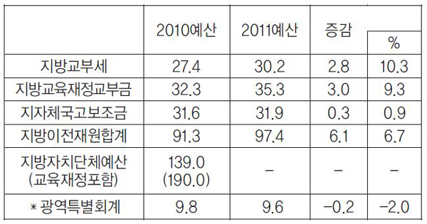 À§ÀÇ Ç¥¿Í°°ÀÌ 2011³âµµ Áö¹æÀÚÄ¡´Üü ¿¹»êÀ» ¾ÆÁ÷ ÆÄ¾ÇÇØ º¸Áö´Â ¸øÇßÁö¸¸, Àüü ¿¹»êÀÇ ¹Ý ÀÌ»óÀ» Â÷ÁöÇÏ´Â Áö¹æÀÌÀüÀç¿øÀº 2010³âµµ¿¡ ºñÇØ 6.1Á¶¿ø Áõ°¡ÇÑ 97.4Á¶¿øÀ̸ç, 6.7%ÀÇ Áõ°¡À²À» º¸À̰í ÀÖ´Ù. ÀÌ´Â Áß¾ÓÁ¤ºÎ ¿¹»êÁõ°¡À² 5.7%¿¡ ºñÇØ ¼öÄ¡»óÀ¸·Î´Â ´Ù¼Ò ³ôÀº ºñÀ²ÀÌ´Ù. ÇÏÁö¸¸ 2009³â±îÁö 10%´ë ÀÌ»óÀÇ Áõ°¡À²À» °è¼ÓÇØ¿Â °Í¿¡ ºñÇϸé Áß¾ÓÁ¤ºÎ¿Í ¸¶Âù°¡Áö·Î ÀçÁ¤ÁöÃâÀÌ Å©°Ô °¨¼ÒµÇ°í ÀÖ´Ù°í ÇÒ ¼ö ÀÖ´Ù.