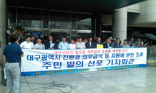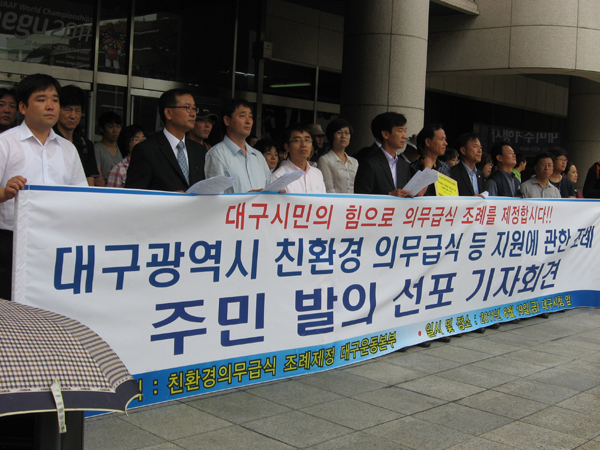 ³ëµ¿, º¹Áö, ±³À°, ¸Ô°Å¸®, Ç®»Ñ¸®´Üü ¹× ¾ß5´ç µî ´ë±¸Áö¿ª 51°³ ´Üü´Â ģȯ°æ Àǹ«±Þ½Ä(¹«»ó±Þ½Ä) Á¶·ÊÁ¦Á¤À» À§ÇØ 8¿ù19ÀÏ ¿ÀÀü 10½Ã30ºÐ 70¿©¸íÀÌ Âü¿©ÇÑ °¡¿îµ¥ ´ë±¸½Ãû¾Õ¿¡¼ ¡®Ä£È¯°æÀǹ«±Þ½Ä Á¶·ÊÁ¦Á¤ ´ë±¸¿îµ¿º»ºÎ¡¯(ÀÌÇÏ Àǹ«±Þ½Ä¿îµ¿º»ºÎ) °á¼º ¹× ¡¸´ë±¸±¤¿ª½Ã ģȯ°æÀǹ«±Þ½Ä µî Áö¿ø¿¡ °üÇÑ Á¶·Ê¡¹¼±Æ÷ ±âÀÚȸ°ßÀ» °¡Á³´Ù. ±âÀÚȸ°ß ÈÄ Àǹ«±Þ½Ä¿îµ¿º»ºÎ´Â Á¶·Ê¾È°ú ´ëÇ¥ÀÚ Áõ¸í¼ ±³ºÎ½ÅûÀ» ´ë±¸½Ã¿¡ Á¦ÃâÇß´Ù.