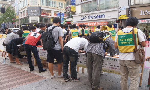 ¡ã 7ÀÏ ¿ÀÈÄ 4½ÃºÎÅÍ 6½Ã±îÁö ´ë±¸¹éÈÁ¡ ¾Õ¿¡¼ ÁøÇàµÈ ģȯ°æ Àǹ«±Þ½Ä Á¶·ÊÁ¦Á¤À» À§ÇÑ °Å¸®¼¸í ¿îµ¿¿¡ ½Ã¹ÎµéÀÌ ³ª¼ ¼¸íÀ» Çϰí ÀÖ´Ù. ÁÖÃÖÃøÀº À̳¯ µÎ½Ã°£µ¿¾È ¾à 700¿© ¸íÀÇ ¼¸íÀ» ¹Þ¾Ò´Ù°í ¹àÇû´Ù. ¨Ï ¿À¸¶ÀÌ´º½º Á¶Á¤ÈƱâÀÚ