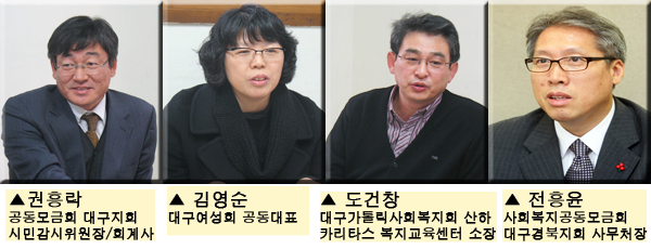 - ÆÐ³Î : ±ÇÈï¶ô(»çȸº¹Áö°øµ¿¸ð±Ýȸ ´ë±¸Áöȸ ½Ã¹Î°¨½ÃÀ§¿øÀå/ȸ°è»ç) ±è¿µ¼ø(´ë±¸¿©¼ºÈ¸ °øµ¿´ëÇ¥) µµ°Çâ(´ë±¸°¡Å縯»çȸº¹Áöȸ »êÇÏ Ä«¸®Å¸½ºº¹Áö±³À°¼¾ÅÍ ¼ÒÀå) ÀüÈïÀ±(»çȸº¹Áö°øµ¿¸ð±Ýȸ ´ë±¸¡¤°æºÏÁöȸ »ç¹«Ã³Àå, ÀÌÇÏ °¡³ª´Ù ¼ø) - »çȸ : ÀºÀç½Ä »ç¹«Ã³Àå - Á¤¸® : ÇÑÈ£½Â Ȱµ¿°¡ - ÀϽà : 2011³â 12¿ù 14ÀÏ ¿ÀÈÄ 7½Ã
