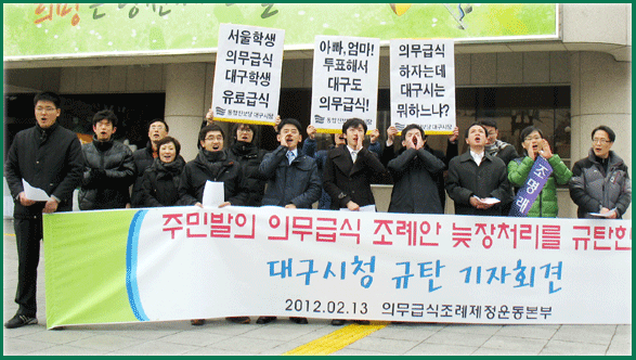 ´ë±¸Áö¿ª 56°³ ½Ã¹Î»çȸ³ëµ¿ ¹× ¾ß´çÀ¸·Î ±¸¼ºµÈ ¡®Ä£È¯°æ Àǹ«±Þ½Ä Á¶·ÊÁ¦Á¤ ´ë±¸¿îµ¿º»ºÎ¡¯´Â ´ë±¸µµ ģȯ°æ Àǹ«(¹«»ó)±Þ½ÄÀ» ½ÇÇöÇϰíÀÚ 2011³â 12¿ù1ÀÏ 32,169¸íÀÇ ´ë±¸½Ã¹Î ¼¸íÀ» ¹Þ¾Æ ´ë±¸½Ã¿¡ û±¸ÀθíºÎ¸¦ Á¦ÃâÇß´Ù.
