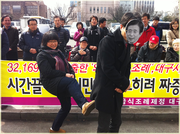 ÀÌ¿¡ ´ë±¸¿îµ¿º»ºÎ´Â 3¿ù 7ÀÏ ¿ÀÀü 11½Ã, ´ë±¸½Ãû¾Õ¿¡¼ ½Ã°£²ø±â·Î ½Ã¹ÎµéÀ» Â¥Áõ³ª°Ô ÇÏ°í ½Ã¹ÎµéÀÇ ¿ä±¸¸¦ ¹«½ÃÇÏ´Â ´ë±¸½Ã¿¡ Ç×ÀÇÇÏ´Â ±Ôź Áýȸ¸¦ ÁøÇàÇÏ¿´´Ù. 30¿©¸íÀÌ Âü¿©ÇÑ ±ÔźÁýȸ¿¡¼´Â ÀºÀç½Ä »ç¹«Ã³ÀåÀÇ »çȸ·Î ½ÃÀÛÇÏ¿© ¡°±Ãµð¸¦ ÁÖ Â÷»ß±î~"¶ó´Â À¯Çà¾î¸¦ ±¸È£·Î Çѽ𣠰¡·® °è¼Ó µÇ¾ú´Ù.