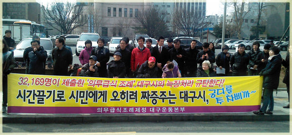 ´Ù¸¥ Áö¿ªÀº ÃʵîÇб³´Â ¹°·Ð ÁßÇб³, À¯Ä¡¿ø±îÁö È®´ëµÇ°í ÀÖÁö¸¸, ´ë±¸´Â ¿©ÀüÈ÷ Â÷º°Àû ¼±º°±Þ½Ä¸¸À» °íÁýÇÏ¸é¼ Àǹ«±Þ½Ä ºÒ¸ðÁö Áö¿ªÀ¸·Î ³²¾Æ ÀÖ´Ù. ¶ÇÇÑ ´Ù¸¥ Áö¿ªÀº ÇàÁ¤ºÎ³ª ÀÇȸ, ±³À°Ã»ÀÌ ³ª¼¼ Á¶·Ê¸¦ Á¦Á¤Çϰųª Á¤Ã¥ÀÇÁö·Î Àǹ«±Þ½ÄÀ» È®´ë½Ç½ÃÇϰí ÀÖÁö¸¸, ´ë±¸¸¸ À¯µ¶ ½Ã¹ÎµéÀÌ Á÷Á¢ ³ª¼ ¼¸í¿îµ¿À» ÆîÄ¡¸é¼ ÁÖ¹Îû±¸Á¶·Ê¸¦ Á¦Á¤Çϰí ÀÖÁö¸¸, ´ë±¸½Ã´Â ÀÌ ¶ÇÇÑ ´ÁÀåó¸®¿Í ½Ã°£²ø±â·Î ¿Ü¸éÇϰí ÀÖ´Ù. ´ë±¸¿îµ¿º»ºÎ´Â ÀÌ·¯ÇÑ ´ë±¸½ÃÀÇ ÇàŸ¦ ½Ã¹Îµé¿¡°Ô ¾Ë¸®±â À§ÇØ ÀÌ´Þ 15ÀϺÎÅÍ 20ÀϱîÁö 6Àϰ£ ´ë±¸Àü¿ªÀ» µµ´Â ¡®°ñ¸ñ±æÅõ¾î ´ëÇàÁø¡¯À» ÁøÇàÇÒ ¿¹Á¤ÀÌ´Ù.