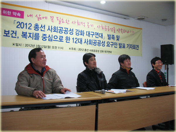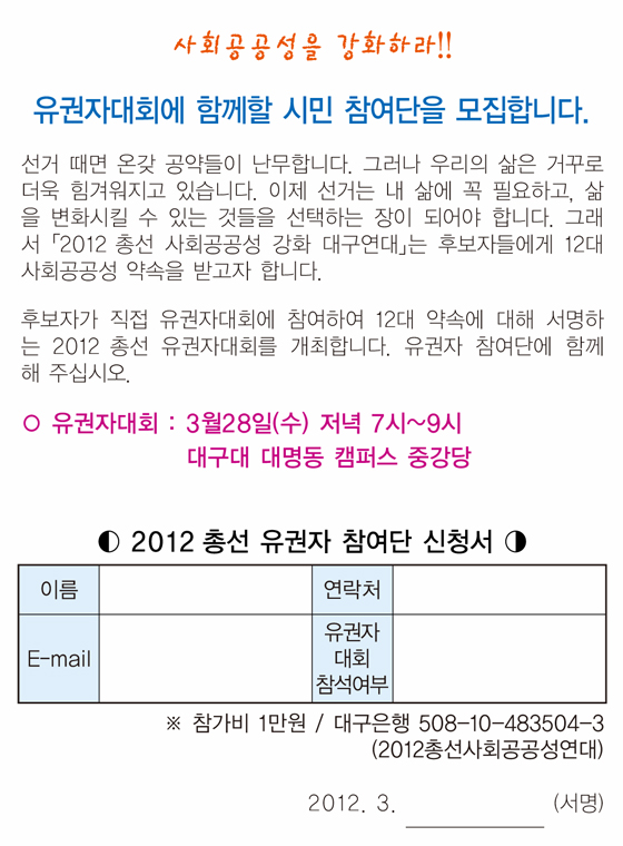 ¡¸2012 ÃѼ± »çȸ°ø°ø¼º °È ´ë±¸¿¬´ë¡¹¹ßÁ·, 12´ë »çȸ°ø°ø¼º ¿ä±¸¾È°ú Àç¿ø¸¶·Ã ¹æ¾È ÁúÀÇ. 3¿ù28ÀÏ 500¸íÀÌ Âü¿©ÇÏ´Â À¯±ÇÀÚ´ëȸ¿¡¼ Èĺ¸ Á÷Á¢ ¼¾à