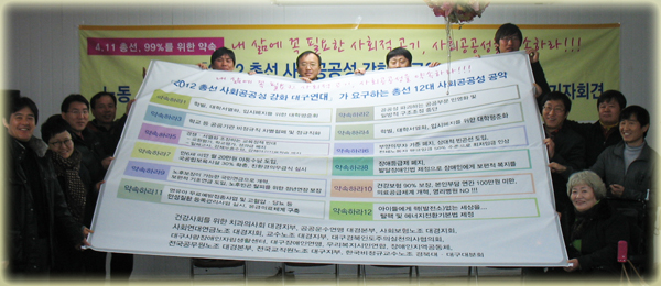 ³¡À¸·Î ±âÀÚȸ°ß¹®À» ³¶µ¶ÇÑ ±ÇÁ¤Ã¥ Çѱ¹ºñÁ¤±Ô±³¼ö³ëÁ¶ ´ë±¸´ëºÐȸÀåÀº ¡°³ëµ¿, ±³À°, º¸°Ç, º¹Áö µîÀ» Áß½ÉÀ¸·Î ÇÑ¡¸¾à¼ÓÇ϶ó, 12´ë »çȸ°ø°ø¼º¡¹¿îµ¿Àº »õ·Î¿î »çȸ¸¦ ÇâÇÑ Á¤Ã¥°ú ºñÀüÀ» ÃÑüÀûÀ¸·Î Á¦½ÃÇÑ °ÍÀ¸·Î, À¯±ÇÀÚ´ëȸ Âü°¡´ÜÀ» Àû±ØÀûÀ¸·Î Á¶Á÷ÇØ ÀÚ¹ßÀûÀÌ°í ´Éµ¿ÀûÀÎ À¯±ÇÀÚ ÇൿÀ¸·Î ³ª¾Æ°¥ ¼ö ÀÖµµ·Ï Çϰڴ١±°í ¸»Çß´Ù.