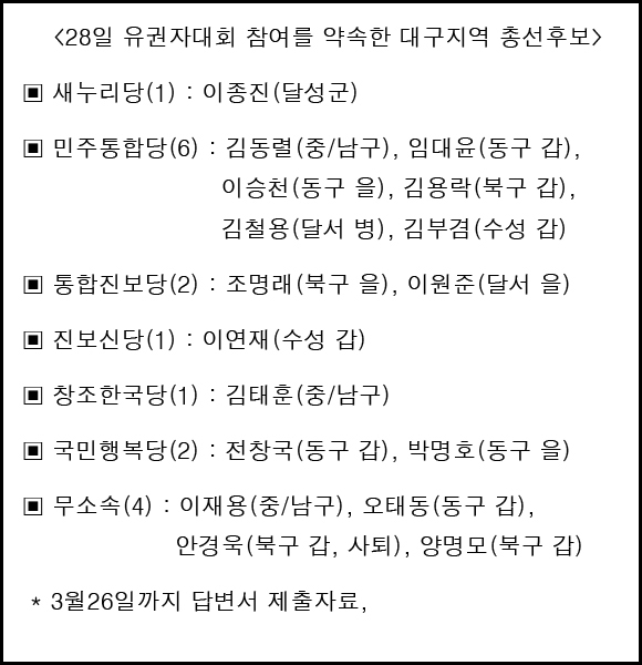 ´ë±¸Áö¿ª ÃѼ± Èĺ¸ÀÚ Áß 28%ÀÎ 17¸í ´äº¯, 28ÀÏ À¯±ÇÀÚ´ëȸ¿¡ 10¸í ¼¾à
