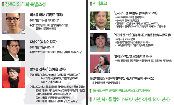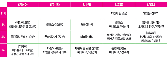 À̾î, 5¿ù 31ÀÏ Àú³á 7½Ã¿¡´Â Àå¾ÖÀÎ ÀÏ»óÀ» ±×¸° ¹Úö¼ø °¨µ¶ÀÇ '´Ù½½ÀÌ(2011)', °°Àº ³¯ ¿ÀÈÄ 4½Ã¿Í 6¿ù 1ÀÏ ¿ÀÈÄ 1½Ã¿¡´Â Àå¾ÖÀÎ °øµ¿Ã¼ ¾ê±â¸¦ ´ãÀº ½É¹Î°æ °¨µ¶ÀÇ '¿ÓºüÀ̾߱â(2012)'°¡ »ó¿µµÈ´Ù. ¶Ç, 6¿ù 1ÀÏ Àú³á 7½Ã¿Í 2ÀÏ ¿ÀÀü 11½Ã¿¡´Â ´ë¾È °¡Á¤ÇüŸ¦ ±×¸° ÀåÇÇ¿¡¸£ ´Ù¸£µ§, ·ó ´Ù¸£µ§ °¨µ¶ÀÇ 'ÀÚÀü°Å ź ¼Ò³â(2011)', 5¿ù 31ÀÏ ¿ÀÈÄ 1½Ã¿Í 6¿ù 2ÀÏ °°Àº ½Ã°£¿¡´Â ÇÁ¶û½º ±³À°°ú À̹ι®Á¦¸¦ ´Ù·ï Ä¿µÈÁ¦ Ȳ±ÝÁ¾·Á»óÀ» ¼ö»óÇÑ ·Î¶ûIJÅ× °¨µ¶ÀÇ 'Ŭ·¡½º(2010)'°¡ »ó¿µµÈ´Ù. ¾Ö´Ï¸ÞÀÌ¼Ç ÀÛǰÀÎ ¿À¼ºÀ± °¨µ¶ÀÇ '¸¶´çÀ» ³ª¿Â ¾Ïż(2011)'µµ 5¿ù 30ÀÏ ¿ÀÈÄ 1½Ã¿Í 6¿ù 3ÀÏ °°Àº ½Ã°£¿¡ ¼±º¸ÀδÙ. ƯÈ÷, '¹ö½º¸¦ Ÿ¶ó'ÀÇ ±èÁ¤±Ù, '´Ù½½ÀÌ'ÀÇ ¹Úö¼ø, '¸»ÇÏ´Â °ÇÃà°¡'ÀÇ Á¤ÀçÀº °¨µ¶Àº °¢°¢ 5¿ù 30ÀÏ, 31ÀÏ, 6¿ù 2ÀÏ Á÷Á¢ °ü°´µé°ú ´ëÈÀÇ ½Ã°£À» °®´Â´Ù.