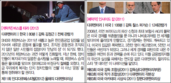 ¡ã Á¦ 3ȸ <´ë±¸ »çȸº¹Áö¿µÈÁ¦> °³¸·ÀÛ°ú Æó¸·ÀÛ / Ãâó. ´ë±¸»çȸº¹Áö¿µÈÁ¦Á¶Á÷À§¿øÈ¸ 2012³â 05¿ù 28ÀÏ (¿ù) 16:27:02 ÆòÈ´º½º ±è¿µÈ ±âÀÚ pnnews@or.kr ´ë±¸Áö¿ª ½Ã¹Î»çȸ´Üü°¡ ÁÖÃÖÇÏ´Â '´ë±¸ »çȸº¹Áö¿µÈÁ¦'°¡ 3¹øÂ° ¸·À» ¿Ã¸°´Ù. ´ë±¸ »çȸº¹Áö¿µÈÁ¦´Â Áö³ 2010³âºÎÅÍ ÇØ¸¶´Ù ¿¸®°í ÀÖ´Ù. ´ë±¸»çȸº¹Áö¿µÈÁ¦Á¶Á÷À§¿øÈ¸´Â "ºó°ï°ú ³ëµ¿, ÁÖ°Å, ÀÇ·á, ±³À°, °¡Á· ¹®Á¦¸¦ Æ÷ÇÔÇÑ ´Ù¾çÇÑ º¹Áö °ü·Ã À̽´¸¦ ¿µÈ¶ó´Â ´ëÁßÀûÀÎ ¸Åü¸¦ ÅëÇØ º¹Áö°¡ º¸ÆíÀû ±Ç¸®ÀÓÀ» ¾Ë¸®±â À§ÇØ ¿µÈÁ¦¸¦ °³ÃÖÇß´Ù"¸ç "º¹Áö¸¦ Á¦´ë·Î ´©¸± ¼ö ÀÖ´Â ´ë¾ÈÀ» ÇÔ²² ¸ð»öÇÏÀÚ"°í ¿µÈÁ¦ ÃëÁö¸¦ ¼³¸íÇß´Ù. ƯÈ÷, À̹ø ¿µÈÁ¦´Â Á¦ 1, 2ȸ ¿µÈÁ¦ º¸´Ù »ó¿µÀϰú »ó¿µÈ¸¼ö°¡ ´Ã¾î³µ´Ù. ¶Ç, ¿µÈÁ¦°¡ ÁøÇàµÇ´Â °¡¿îµ¥ '°¨µ¶°úÀÇ ´ëÈ'¿Í '¾¾³×ÅäÅ©'¸¦ ºñ·ÔÇÑ º¹Áö»çÁøÀü, ¿ÀÄ«¸®³ª ¿¬ÁÖ, Æ÷Åä Á¸ µîÀÇ ´Ù¾çÇÑ ºÎ´ëÇà»çµµ ¸¶·ÃµÈ´Ù. 5ÀÏ µ¿¾È ¿¸®´Â À̹ø ¿µÈÁ¦ °³¸·ÀÛÀº ¢º'¹ö½º¸¦ Ÿ¶ó'(2012. °¨µ¶ ±èÁ¤±Ù), ¢ºÆó¸·ÀÛÀº Âû½º ÆÛ°Å½¼ °¨µ¶ÀÇ 'ÀλçÀ̵å Àâ'(2011)ÀÌ »ó¿µµÈ´Ù. '¹ö½º¸¦ Ÿ¶ó'´Â ÇÑÁøÁß°ø¾÷ »çÅÂ¿Í Èñ¸Á¹ö½º¸¦ ´Ù·é ´ÙÅ¥¸àÅ͸®·Î Á¦11ȸ Àεð´ÙÅ¥Æä½ºÆ¼¹ß(2012) ¿ÃÇØÀÇ ´ÙÅ¥¸àÅ͸®»óÀ» ¼ö»óÇß°í, 'ÀλçÀ̵å Àâ'Àº 2008³â ±ÝÀ¶À§±â¸¦ ÁÖÁ¦·Î ÇÑ ´ÙÅ¥¸àÅ͸®·Î ¹Ì±¹ ¾ÆÄ«µ¥¹Ì ½Ã»ó½Ä(2011) ÀåÆí´ÙÅ¥¸àÅ͸®»óÀ» ¹Þ¾Ò´Ù.