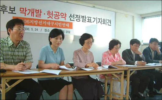 5.31Áö¹æ¼±°Å°¡ ÀÏÁÖÀÏ ¾ÕÀ¸·Î ´Ù°¡¿Â °¡¿îµ¥, ´ë±¸½ÃÀå È帵éÀÌ ³½ °ø¾à »ó´ç¼ö°¡ ¡®¸·°³¹ß.Çê°ø¾à¡¯À̶ó´Â ºÐ¼®ÀÌ ³ª¿Ô´Ù. ´ë±¸Âü¿©¿¬´ë¸¦ ºñ·ÔÇÑ 16°³ ½Ã¹Î´Üü·Î ±¸¼ºµÈ [2006Áö¹æ¼±°Å ´ë±¸½Ã¹Î¿¬´ë]´Â ¿À´Ã(5.24) ¿ÀÀü ´ë±¸¿©¼ºÈ¸°´ç¿¡¼ ±âÀÚȸ°ßÀ» °®°í, ´ë±¸½ÃÀå È帵éÀÇ °ø¾à °¡¿îµ¥ ´ëÇ¥ÀûÀÎ ¡®¸·°³¹ß.Çê°ø¾à¡¯ 15°¡Áö¸¦ ¼±Á¤ÇØ ¹ßÇ¥Çß´Ù.