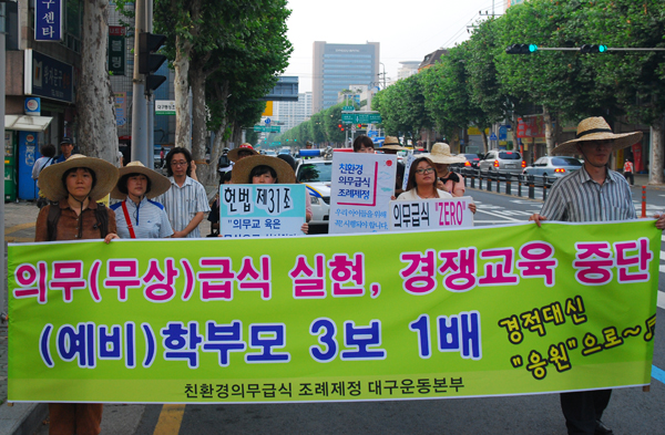 ´ë±¸µµ Àǹ«(¹«»ó)±Þ½Ä Á» ÇÏÀÚ, Çкθð 3º¸1¹èÀÇ ÀÇ¹Ì Áö³ÁÖ ÀÏÁ¦°í»ç ¹Ý´ë ±³»ç 3º¸1¹è¿¡ À̾î 7¿ù4ÀÏ 40¿©¸íÀÌ Âü¿©ÇÑ °¡¿îµ¥ ¡®Àǹ«±Þ½ÄÁ¶·ÊÁ¦Á¤À» Ã˱¸ÇÏ´Â (¿¹ºñ)Çкθð 3º¸1¹è¡¯°¡ ´ë±¸½Ã±³À°Ã»¿¡¼ Ãâ¹ßÇØ ¿ìµ¿±â ±³À°°¨ ÀÚÅñîÁö ÁøÇàµÇ¾ú´Ù. ´ë±¸¿¡ »ç´Â ¿ì¸®´Â ¹«¾ùÀ» ÇØ¾ß Çϳª? ÇкθðµéÀÌ 3º¸1¹è¸¦ Á÷Á¢ ÇÑ´Ù´Â °ÍÀº ÈçÇÑ ÀÏÀÌ ¾Æ´Ï´Ù. ¸ÅÀÏ ¸ÅÀÏ ½ñ¾ÆÁ® ³ª¿À´Â ±³À°°ü·Ã À̽´´Â ½Èµç ÁÁµç ÇкθðµéÀ» ±³À°¿¡ ÁýÁßÄÉ ÇÑ´Ù. ±×¸®°í Àڽŵµ ¸ð¸£°Ô, ¶Ç´Â ¾î¿ ¼ö ¾øÀÌ ¾ÆÀ̵éÀ» °æÀï±³À°¿¡ ¸ô¾Æ ³Ö°í ÀÖ´Ù. À̰ÍÀÌ À߸øµÇ¾ú´Ù°í »ý°¢ÇÏÁö¸¸, °³ÀÎÀû ¼ºÂûÀ̳ª ÀúÇ×Àº ºÎ¸ð·Î¼ÀÇ Àγ»¸¦ ½ÃÇèÇÒ »Ó ±³À°È¯°æÀº ´Þ¶óÁöÁö ¾Ê°í ±Ý¹æ ü³äÇÏ°Ô ¸¸µç´Ù. Àǹ«(¹«»ó)±Þ½ÄÀ¸·Î ±³À°È¯°æ Àü¹ÝÀ» ´Ù ¹Ù²Ü ¼ö ¾ø´Ù´Â °ÍÀº ´©±¸³ª ´Ù ¾Æ´Â »ç½ÇÀÌ´Ù. Àǹ«±Þ½ÄÀÌ Àü±¹ÀÇ 80%ÀÌ»ó ±âÃÊÀÚÄ¡´Üü¿¡¼ ½Ç½ÃµÇ°í ÀÖ´Ù´Â °ÍÀº ÀÛÀº º¯ÈÀÇ ¹°²¿¸¦ ¶è ±× ÀÌ»óÀÇ Àǹ̰¡ ÀÖÀ¸¸ç, ÀÌ º¯È´Â ¶Ç ´Ù¸¥ ÁúÀûº¯È¸¦ °¡Á®¿Ã °ÍÀÌ´Ù. ±×°Íµµ ºü¸£°Ô. ±×·¯³ª Àǹ«±Þ½Ä ¸¶Àúµµ üÇèÇÏÁö ¸øÇϰí ÀÖ´Â ´ë±¸¿¡ »ç´Â ¿ì¸®´Â ¹«¾ùÀ» ÇØ¾ß Çϳª? ´Ù¸¥ Áö¿ªÀ̾úÀ¸¸é ¾ÈÇØµµ µÉ ³ë·ÂÀÌÁö¸¸, ²÷ÀÓ¾øÀÌ ¿ä±¸ÇÒ ¼ö ¹Û¿¡ ¾ø´Ù. À̰ÍÀÌ ´ë±¸¿¡ »ç´Â ½Ã¹ÎÀÇ ¾÷º¸ÀÏ ¼öµµ ÀÖ´Ù.
