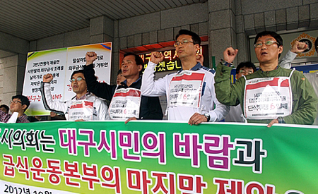 Áö³ 9¿ù11ÀÏ ´ë±¸½ÃÀÇȸ ÇàÁ¤ÀÚÄ¡À§¿øÈ¸ÀÇ ³¯Ä¡±â Åë°úÀÌÈÄ 12ÀϺÎÅÍ ´Ü½Ä³ó¼º¿¡ µé¾î°£ ¡®Ä£È¯°æ Àǹ«±Þ½Ä Á¶·ÊÁ¦Á¤ ´ë±¸¿îµ¿º»ºÎ¡¯(ÀÌÇÏ Àǹ«±Þ½Ä¿îµ¿º»ºÎ)´Â ´Ü½Ä³ó¼º 6ÀϰÀÎ 17ÀÏ ¿ÀÀü ¿ìõÁßÀ̾úÁö¸¸ ±âÀÚȸ°ßÀ» °®°í ´ë±¸½ÃÀÇȸ¿¡ ÃÖÈÄÅëø ¼öÁ¤ Á¦¾ÈÀ» ÇÏ¿´´Ù.