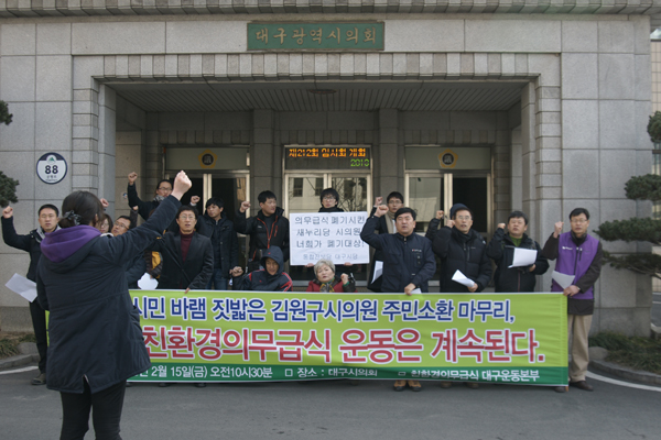 ±è¿ø±¸ ½ÃÀÇ¿ø ÁֹμÒȯ ¸¶¹«¸®. ±×·¯³ª Àǹ«±Þ½Ä¿îµ¿Àº ÁߴܾøÀÌ °è¼ÓµÈ´Ù. ´ë±¸¿¡¼ óÀ½ ½ÃµµµÈ ÁֹμÒȯÀÌ ½ÇÆÐÇß´Ù. ÇöÀç ÁֹμÒȯ¹ý¿¡ ÀÇÇÏ¸é ±¤¿ª½ÃÀÇ¿øÀÇ °æ¿ì, ÁֹμÒȯ ¼¸í¿îµ¿±â°£Àº 60ÀÏÀ̸ç ÇØ´çÁö¿ª À¯±ÇÀÚÀÇ 20% ¼¸íÀ» ¹Þ¾Æ¾ß ÁÖ¹ÎÅõÇ¥·Î À̾îÁú ¼ö ÀÖ´Ù. ¶ÇÇÑ ´ë¼± µî °øÁ÷¼±°Å°¡ ÀÖÀ» °æ¿ì ¼±°Å Àü 60Àϰ£Àº ¼¸í¿îµ¿À» ¸øÇϵµ·Ï ±ÔÁ¤µÇ¾î ÀÖ´Ù. Àǹ«±Þ½Ä¿îµ¿º»ºÎ´Â Áö³ÇØ 9¿ù20ÀÏ ÁÖ¹Îû±¸Á¶·ÊÀÎ Àǹ«±Þ½Ä Á¶·Ê¸¦ ´©´õ±â ½Ä¹°Á¶·Ê·Î ¸¸µé¾î ³¯Ä¡±â·Î Åë°ú½ÃŲ ±è¿ø±¸ ´ë±¸½ÃÀÇȸ ÇàÁ¤ÀÚÄ¡À§¿øÀåÀ» »ó´ë·Î ÁֹμÒȯ(recall)À» ½ÃÀÛÇßÀ¸³ª, ´ë¼±À¸·Î Áߴܵǰí ÃßÀ§µµ °ãÃÄ ¼¸í¿îµ¿À» ¿øÈ°ÇÏ°Ô Àü°³ÇÏÁö ¸øÇß´Ù°í ¹àÇû´Ù. ±×·¯³ª ¹«¾ùº¸´Ùµµ ÁֹμÒȯÁ¦µµ ÀÚü°¡ °¡È¤ÇÒ Á¤µµ·Î ±î´Ù·Î¿ö, »ç½Ç»ó Áö¿ª À¯±ÇÀÚÀÇ 20%, ¾à 1¸¸3õ¿©¸íÀÇ ¼¸íÀ» 60Àϸ¸¿¡ ¹Þ´Â´Ù´Â °ÍÀº »ç½Ç»ó ºÒ°¡´ÉÇß´Ù°í ¹àÇû´Ù. ½ÃÀÇ¿ø º¸±È¼±°Å¿¡¼ ÅõÇ¥À²ÀÌ 20%¸¦ ³Ñ±â Èûµç Çö½ÇÀ» °¨¾ÈÇϸé ÁֹμÒȯ ÀÚü¸¦ ºÒ°¡´ÉÇÏ°Ô ¸¸µç ¹ýÀ̶ó´Â º¼¸à¼Ò¸®µµ ³ª¿Ô´Ù. ÀºÀç½Ä Àǹ«±Þ½Ä¿îµ¿º»ºÎ ÁýÇàÀ§¿øÀåÀº “¸ÅÁÖ Áö¿ªÁÖ¹ÎÀ» Á÷Á¢ ¸¸³ª ÁֹμÒȯÀÇ ÀÇ¹Ì¿Í ´ë±¸½ÃÀÇȸÀÇ È¾Æ÷, Àǹ«±Þ½Ä¿îµ¿ÀÇ Çʿ伺 µîÀ» Àü´ÞÇϸç Áö¿ªÁÖ¹ÎÀ» ¹«½ÃÇÏ°í ¿ªÇàÇÏ¸é¼ µ¶´Ü°ú ÀüȾÀ» Èֵθ¥ ¼±ÃâÁ÷¿¡ ´ëÇØ¼´Â ¹Ýµå½Ã ½ÉÆÇÇÑ´Ù´Â »ç·Ê”¸¦ ³²±â°í ½Í¾ú´Ù°í ¸»Çß´Ù. 2011³â 9¿ù¿¡ ½ÃÀÛµÈ Àǹ«±Þ½Ä¿îµ¿, 1³â¿©µ¿¾È ÁغñÇϰí 3¸¸2õ¿©¸íÀÇ ´ë±¸½Ã¹ÎÀÌ Áֹεî·Ï¹øÈ£±îÁö ±âÀçÇØ û±¸ÇÑ Àǹ«±Þ½ÄÁ¶·Ê¸¦ ´ë±¸½ÃÀÇȸ°¡ ´ë±¸½Ã¿Í ´ë±¸½Ã±³À°Ã»°ú ¹Ð½Ç¾ßÇÕÇÏ¿© ÇѼø°£¿¡ ¹°°ÅǰÀ¸·Î ³¯¸° °Í¿¡ ´ëÇÑ ±ÔźÀÌ ÀÏÂ÷Àû ¸ñÇ¥¿´´Ù´Â °ÍÀÌ Àǹ«±Þ½Ä¿îµ¿º»ºÎÀÇ ¼³¸í. <´ë±¸½Ã±³À°Ã» ¼Òµæ°ú ÀÚ»êÁ¶»ç ´õ¿í °È, ±ÝÀ¶Á¤º¸±îÁö ´Ù Á¶È¸ÇÑ´Ù> ºñ·Ï ÁֹμÒȯÀº ¸øÇßÁö¸¸, Àǹ«±Þ½Ä¿îµ¿Àº ÁߴܾøÀÌ °è¼ÓµÈ´Ù. °á°úÀûÀ¸·Î °¡³À» Áõ¸íÇÏ´Â ¼Òµæ°ú ÀÚ»êÁ¶»ç ´ë½Å º¸ÆíÀû ¹æ½ÄÀ¸·Î Çб³±Þ½ÄÀ» Çϱâ À§ÇØ Àǹ«±Þ½Ä¿îµ¿ÀÌ ½ÃÀ۵Ǿú´Âµ¥, ´ë±¸´Â ¿ÃÇØ µé¾î ´õ¿í °ÈµÈ ¼Òµæ, ÀÚ»êÁ¶»ç¸¦ Çϰڴٰí ÇÏ´Ï ÂüÀ¸·Î ¾ÆÀÌ·¯´ÏÇÏ´Ù´Â ÁöÀûÀÌ´Ù. ¶ÇÇÑ Àǹ«±Þ½ÄÀ» ÀÌ¹Ì ½ÃÇàÇϰí ÀÖ´Â ´Ù¸¥ Áö¿ªÀº ºÎ¸ðÀÇ ¼Òµæ, ÀÚ»êÁ¶»ç°¡ ÇÊ¿ä¾ø´Âµ¥, ´ë±¸ µî ÀϺÎÁö¿ª¸¸ Á¶»ç¸¦ ÇÏ´Â ²ÃÀÌ¾î¼ ½Ã¹Îµé·ÎºÎÅÍ Å« ÀúÇ×À» ºÒ·¯ ¿Ã °ÍÀ¸·Î ¿¹»óµÈ´Ù. 2013³â ´ë±¸¿¡¼ ±Þ½ÄÀ» ¹«»óÀ¸·Î ¹Þ±â À§Çؼ´Â ÃÊ, ÁßÇб³ÀÇ °æ¿ì 4Àΰ¡Á· ±âÁØ ÃÖÀú»ý°èºñ 340%ÀÎ 526¸¸¿ø, °íµîÇб³´Â 260%ÀÌÇÏ 403¸¸¿øÀÌ¸é ½ÅûÀÌ °¡´ÉÇÏ´Ù(2012³âÀº ÃÖÀú»ý°èºñ 200%ÀÌÇÏ). Áß»êÃþµµ ´ëºÎºÐ Æ÷ÇԵǴ ±Ô¸ð´Ù. ±×·±µ¥ ¹®Á¦´Â ¿ù5¸¸¿ø ±Þ½ÄÁö¿øÀ» ¹Þ±â À§ÇØ ¼ÒµæÀç»ê½Å°í¼, ±ÝÀ¶Á¤º¸ µî Á¦°ø µ¿ÀǼ, ºÎäÁõ¸í¼, Àü¿ù¼¼°è¾à¼ µî °¢Á¾ ÀڷḦ Á¦ÃâÇØ¾ß ÇÑ´Ù. ½ÅûÇÑ´Ù°í ¶Ç ´ÙÁÖ´Â °ÍÀÌ ¾Æ´Ï´Ù. ½ÅûÀÚ°¡ ¸ô¸®¸é ¿¹»êÀÇ ¹üÀ§³»¿¡¼ 2Â÷, 3Â÷ ¶Ç ¼±º°ÇÏ´Â ¹æ½ÄÀÌ´Ù. ÀÌ ¹®Á¦¿¡ ´ëÇØ¼´Â Á¶¸¸°£ ÀÔÀåÀ» ¹àÈú ¿¹Á¤ÀÌ´Ù. ¾Æ¹«Æ° ¾Æ½±°Ôµµ recall ÇÏÁö´Â ¸øÇß´Ù. ±×·¯³ª 2014³â Áö¹æ¼±°Å¿¡¼ Áö¿ªÁֹεéÀÌ Ç¥·Î ½ÉÆÇÇÏ±æ ±â´ëÇÑ´Ù.