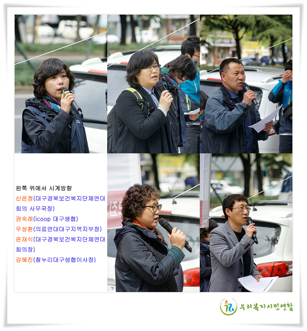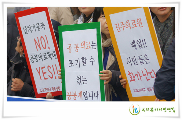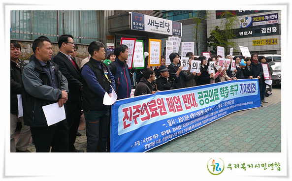 ¿À´Ã 4¿ù 15ÀÏ(¿ù) ¿ÀÀü 11½Ã »õ´©¸®´ç ´ë±¸±¤¿ª½Ã´ç ¾Õ¿¡¼ icoop ´ë±¸¼ÒºñÀÚ»ýȰÇùµ¿Á¶ÇÕ, ¿ì¸®º¹Áö½Ã¹Î¿¬ÇÕ, °ø°ø¿î¼ö³ëÁ¶ ´ë°æº»ºÎ µî ´ë±¸°æºÏº¸°Çº¹Áö´Üü¿¬´ëȸÀÇ ¿Ü 13°³ ´Üü°¡ ÁÖ°üÇÑ ÁøÁÖÀÇ·á¿ø Æó¾÷¹Ý´ë, °ø°øÀÇ·á È®´ë°È Ã˱¸ ±âÀÚȸ°ßÀÌ 40¿©¸íÀÌ Âü¿©ÇÑ °¡¿îµ¥ ¿·È´Ù.