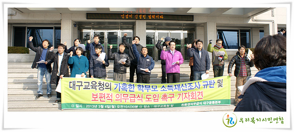 [»çÁøÃâó: °æÇâ½Å¹®] °¥¼ö·Ï Å»ê, ½ÇŸ·¡ º¸´Ù ´õ ¾ôÈù ´ë±¸ ±Þ½ÄÁ¤Ã¥. Çѳ¢ ¹ä¸Ô±â Èûµå³×... "±³À°ºñ ½ÅûÇ׸ñ Áß °í±³Çкñ(µî·Ï±Ý) ¼±Á¤°á°ú Áö¿ø´ë»óÀÚ·Î ¼±Á¤µÇÁö ¾Ê¾Ò½À´Ï´Ù." ÇкθðµéÀ» Â¥Áõ³ª°Ô ¸¸µç ¹®ÀÚ Å뺸 Áö³ 3¿ù15ÀϱîÁö ¸¶°¨µÈ 2013³âµµ ±³À°ºñ½Åû °á°ú, À̰°Àº ¹®ÀÚÅ뺸¸¦ ¹ÞÀº ´ë±¸ÀÇ ÇкθðµéÀÌ ¸¹´Ù. ¿Ö³ÄÇÏ¸é ´ë±¸ÀÇ ±Þ½Äºñ ½Åû±âÁØÀÌ ÃÖÀú»ý°èºñ 340%(¼ÒµæÀÎÁ¤¾× 526¸¸¿ø, °íµîÇб³´Â 260% 403¸¸¿ø)·Î Àü±¹¿¡¼ °¡Àå ³ôÀº ±âÁØÀ» Á¦½ÃÇØ ´ë°Å ½ÅûÀÌ ¸ô·ÈÁö¸¸, ±³À°ºñ ½ÅûÇ׸ñ(±Þ½Äºñ, °í±³Çкñ, ¹æ°úÈÄ ÀÚÀ¯¼ö°±Ç, Á¤º¸ÈÁö¿ø µî 4Á¾)ÀÌ ºÐ¸®µÇ¾î ½ÅûµÇ´Â °ÍÀÌ ¾Æ´Ï¶ó Àϰý ÇÑ ¼¼Æ®·Î ÀÌ·ç¾îÁö´Ù º¸´Ï ¹ú¾îÁö´Â ÇØÇÁ´×. ¹®ÀÚ¸¦ ¹Þ¾Æ º» ÇкθðµéÀº Â¥ÁõÀÌ ³´Ù. ±Þ½Äºñ¸¦ Á¦¿ÜÇÏ¸é ´Ù¸¥ 3°¡Áö´Â ´ëºÎºÐ ÃÖÀú»ý°èºñ 120% ¶Ç´Â 130% ¼öÁØÀ¸·Î ±Þ½Äºñ ±âÁغ¸´Ù´Â ³Ê¹«³ª Â÷À̰¡ ¸¹ÀÌ ³ª±â ¶§¹®. ½Åû±âÁØÀÌ Áö¿ø±âÁØÀ¸·Î µ¹º¯. ÇÑÄ¡ ¾Õµµ ¸ø º» ºÎ½Ç±³À°ÇàÁ¤ ´ë±¸½Ã±³À°Ã»ÀÇ ¿ÃÇØ Çб³±Þ½ÄÁö¿ø ±âÁØÀÌ °ø°³µÇ¾ú´Ù. ´çÃÊ ½Åû ½Ã °øÁöÇÑ ÃÊ․ÁßÇб³ ÃÖÀú»ý°èºñ 340%(¼ÒµæÀÎÁ¤¾× 526¸¸¿ø ÀÌÇÏ, 4Àΰ¡Á·), °íµîÇб³ 260%(403¸¸¿ø ÀÌÇÏ)´Ù. 400ÀÎ ÀÌÇÏ Çб³ÀÇ ÇлýµéÀº ÀÛ³â°ú µ¿ÀÏÇÏ°Ô ºÎ¸ðÀÇ ¼Òµæ¿©ºÎ¿Í °ü°è¾øÀÌ Çб³±Þ½Äºñ¸¦ ³»Áö ¾Ê¾Æµµ µÈ´Ù. ´ë±¸½Ã±³À°Ã»Àº ÃÊ, Áß 340%, °í 260% ÀÌÇÏ ½Åû±âÁØÀÌ Áö¿ø±âÁØÀÌ ¾Æ´ÔÀ» ±×µ¿¾È ¼öÂ÷·Ê °Á¶ÇØ ¿Ô°í, Àϼ± Çб³´Â 4¿ù¸» ½Åû±âÁØÀÌ Áö¿ø±âÁØÀÌ ¾Æ´ÔÀ» °Á¶ÇÏ´Â Åë½Å¹®À» ¹ß¼ÛÇß´Ù. ±×·±µ¥ ¾îÂîµÈ ¿µ¹®ÀÎÁö, ½Åû±âÁØÀÌ Áö¿ø±âÁØÀ¸·Î µ¹º¯Çß´Ù. ¹Ù·Î ÇüÆò¼º ¹®Á¦ ¶§¹®À̾ú´Ù. ´ë±¸½Ã±³À°Ã»ÀÌ °í½É ³¡¿¡ ³»¸° °áÁ¤ÀÌÁö¸¸, ÇÑÄ¡ ¾Õµµ º¸Áö ¸øÇÏ´Â ºÎ½Ç ±³À°ÇàÁ¤À̶ó´Â ºñ³Àº ¸éÇϱâ Èûµé µí ÇÏ´Ù. »ç½Ç, À̰°Àº ½Åû±âÁØÀº óÀ½ºÎÅÍ ¸¹Àº ³í¶õÀ» ³º¾Ò´Ù. ¿ìµ¿±â±³À°°¨Àº Àú¼ÒµæÃþ ¼±º°±Þ½ÄÀ» ±×µ¿¾È °íÁýÇߴµ¥, ´ë±¸´Â 526¸¸¿øÀÌÇϵµ Àú¼ÒµæÃþÀ̶ó´Â ºñ¾Æ³É°Å¸®°¡ µÇ¾ú´Ù. Àú¼ÒµæÃþ ¼±º°±Þ½ÄÀÌ Áß»êÃþ ¼±º°±Þ½ÄÀ¸·Î º¯ÁúµÈ ¼À. °á°úÀûÀ¸·Î ´ë±¸½Ã±³À°Ã»Àº 14¸¸2õ¸í¿¡ ´ëÇØ ¿¹»êÀ» Ã¥Á¤ÇßÁö¸¸, ³ô¾ÆÁø ±âÁØ Å¿ÀÎÁö 15¸¸¸íÀÌ Çб³±Þ½ÄÀ» Áö¿ø¹Þ°Ô µÇ¾ú´Ù. ¿¹»êµµ 34¾ï¿øÀÌ Ãß°¡ ¼Ò¿äµÈ´Ù. ´Ã¾î³ 8õ¸íÀ» ´Ù½Ã ¼ÒµæÀç»ê±âÁØ¿¡ ÀÇÇØ ¼±º°ÇÑ´Ù´Â °ÍÀº °¡´ÉÀº ÇÏÁö¸¸, ´Ù½Ã ±âÁØÀ» Á¤ÇϱⰡ ¾Ö¸ÅÇÏ°í °æ°è¼±¿¡ ÀÖ´Â À̵éÀÌ »ó´ëÀûÀ¸·Î ¸¹À» ¼ö ÀÖ°í, ÀÌ·Î ÀÎÇØ ½ñ¾ÆÁö´Â ¹Î¿ø°ú ºñ³À» °¨¼öÇϱ⿡µµ »ó´çÈ÷ ºÎ´ã½º·¯¿üÀ» °ÍÀÌ´Ù. ÀÌ´Â ÃæºÐÈ÷ ¿¹°ßµÈ ÀÏÀ̰í, ½Ã¹Î»çȸ¿¡¼µµ ÁöÀûÇÑ ºÎºÐÀ̾ú´Ù. °¡È¤ÇÑ ¼ÒµæÀç»êÁ¶»ç ÈÄÀ¯Áõ, ½Åû±âÁØ ÀÌÇÏ¸é¼ ½ÅûÇÏÁö ¾ÊÀº ÇлýÀº? ÃÊ, ÁßÇб³ Àǹ«±Þ½ÄÀ» ½Ç½ÃÇÏ´Â ´Ù¸¥ Áö¿ªÀº ºÎ¸ðÀÇ ¼ÒµæÀç»êÁ¶»ç°¡ ÇÊ¿ä¾ø¾ú´Ù. ´ÜÁö, °íµîÇб³ÀÇ ÀÏºÎ ÇØ´ç Çкθðµé¸¸ ½ÅûÀ» ÅëÇØ ¼ÒµæÀç»êÁ¶»ç °úÁ¤À» °ÅÄ¡¸é ³¡À̾ú´Ù. ±×·¯³ª ´ë±¸´Â ¸ðµç ÇкθðµéÀÌ ½ÅûÀ» ÇØ¾ß Çß´Ù. ±×·±µ¥ ¼ÒµæÀç»êÁ¶»ç·Î ÀÎÇØ ½ÅûÇÏÁö ¸øÇÑ Çкθðµéµµ ÀÖ´Ù´Â °ÍÀÌ´Ù. ±×·±µ¥ À̵éÀ» ±¸Á¦ÇÒ ¹æ¹ýÀº ÇöÀç·Î¼´Â ¾ø´Ù. Å»¶ôÇÑ ÇлýÀ̸é ÃÖ¼Ò ¿ù¼ÒµæÀÎÁ¤¾×ÀÌ 526¸¸¿øÀÌ»óÀÏ ÅÙµ¥, ¹«½¼ ¸í¸ñÀ¸·Î ÀÓÀÇ·Î ´ãÀÓ±³»ç°¡ ±¸Á¦ÇÒ ¼ö ÀÖ´Ü ¸»Àΰ¡?