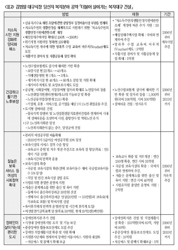 ¿ì¸®º¹Áö½Ã¹Î¿¬ÇÕ(ÀÌÇÏ º¹Áö¿¬ÇÕ)Àº Áö³ 2¿ù Á¤±âÃÑȸ¸¦ ÅëÇØ¼¡®´ë±¸Áö¿ª º¹ÁöÀÇ Á¾ÇÕÀûÀΠû»çÁøÀ» ¸¸µéÀÚ¡¯´Â ¸ñÇ¥ ¾Æ·¡ Áö¹æ¼±°Å Á¤Ã¥¿îµ¿À» ÆîÄ¥ °ÍÀ» ¼±¾ðÇß´Ù. 5¡¤31 Áö¹æ¼±°Å°¡ ³¡³ Áö±Ý, °ø¾àȿÀ» ÅëÇØ ¼±°Å ±¹¸é¿¡¼ÀÇ º¹ÁöÁ¤Ã¥À» ÃÖ´ëÇÑ ¹Ý¿µ½Ã۰íÀÚÇß´ø ¿ì¸®ÀÇ ¸ñÇ¥´Â ¾ó¸¶³ª ´Þ¼ºµÇ¾ú´Â°¡¸¦ Á¡°ËÇØ º¸°íÀÚ ÇÑ´Ù. º¹Áö¿¬ÇÕÀº ´ë±¸½ÃÀåÈĺ¸¿¡°Ô º¹Áö°ø¾àÀ» Á¦¾ÈÇß°í, ¶Ç È帵éÀÇ °ø¾àµµ ÇÔ²² °ËÁõÇß´Ù. ±×·¯³ª ´ç¼±ÀÌ À¯·ÂÇÑ Çѳª¶ó´ç È帰¡ ½Ã¹Î»çȸÀÇ °ø¾àÁúÀÇ¿¡ ´ëÇØ ¹¬¹¬ºÎ´äÀ¸·Î ÀϰüÇß°í, Èĺ¸ÀÚ°¡ Á¦½ÃÇÑ º¹Áö°ø¾àµµ ±¸»ö¸ÂÃß±â½ÄÀ¸·Î ³ª¿µÇ¾î ÀÖ´Â ¼öÁØÀ̾ú´Ù. Èĺ¸ÀÚµéÀÌ ÀϹæÀûÀ¸·Î Á¦½ÃÇÏ´Â °ø¾àµéÀ» ´Ü¼øÇÏ°Ô Æò°¡ÇÏ´Â Â÷¿øÀ» ³Ñ¾î¼¼, Á¤Ã¥ ÀÇÁ¦¸¦ ¹ß±¼ÇÏ¿© Èĺ¸ÀÚµé·Î ÇÏ¿©±Ý ´ç¼± ÀÌÈÄ ÀÔ¾ÈÇϰí ÁýÇàÇϵµ·Ï Çϱâ À§ÇØ Áö³ 5¿ù 1ÀÏ º¹Áö¿¬ÇÕÀº¡®´ë±¸½ÃÀåÈĺ¸µé¿¡°Ô Á¦¾ÈÇÏ´Â º¹Áö°ø¾à¡¯À» ¿¹ºñÈĺ¸ 6¸í¿¡°Ô ÁúÀÇÇÏ¿´°í, äÅÿ©ºÎ¿Í ÀÌÇà°èȹÀ» ¹àÈú °ÍÀ» ¿äûÇÏ¿´´Ù. 5¸íÀÇ ´ë±¸½ÃÀåÈ帵éÀº ÁúÀÇ¿¡ ´ëÇÑ Ã¤Åÿ©ºÎ¿Í ±âŸ Ãß°¡ ÀǰßÀ» Á¦½ÃÇÏ´Â ´äº¯À» º¸³»¿ÔÁö¸¸, Çѳª¶ó´ç ±è¹üÀÏ È帴 °³º° ÁúÀÇ¿¡ ´ëÇÑ Áï´äÀº ȸÇÇÇÑ Ã¤ Ãß»óÀû ¼öÁØÀÇ Á¾ÇÕÀûÀÎ Àǰ߸¸ º¸³»¿Ô´Ù. <Ç¥1>Àº ´ÙÀ½Àº ´ë±¸½ÃÀåÀ¸·Î ´ç¼±µÈ ±è¹üÀÏ Èĺ¸ÀÇ ´äº¯ Àü¹®ÀÌ´Ù.