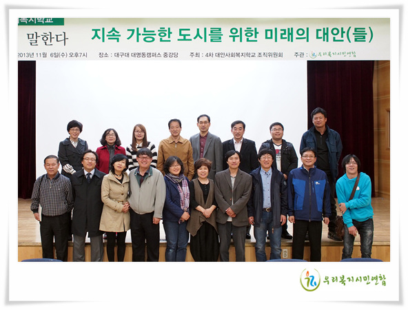 4Â÷ ´ë¾È»çȸº¹ÁöÇб³ 4°, <Áö¼Ó °¡´ÉÇÑ µµ½Ã¸¦ À§ÇÑ ¹Ì·¡ÀÇ ´ë¾È(µé)>2013.11.11 ±Û¾´ÀÌ : º¹Áö¿¬ÇÕ |