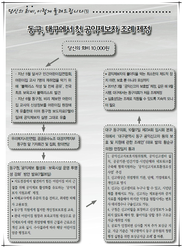 µ¿±¸, ´ë±¸¿¡¼ ù °øÀÍÁ¦º¸ÀÚ Á¶·Ê Á¦Á¤ Áö³ 5¿ù ´Þ¼±¸ ¹Î°£¾î¸°ÀÌÁý¿¬ÇÕȸ ºí·¢¸®½ºÆ® ÀÛ¼º ¹× °øÀ¯ »ç°Ç, 6¿ù µ¿±¸Ã»¿¡ ¾î¸°ÀÌÁýÀÇ ºñ¸®¸¦ Á¦º¸ÇÑ º¸À°±³»çÀÇ ½Å»óÁ¤º¸¸¦ µ¿±¸Ã»ÀÌ ¾î¸°ÀÌÁý ¿øÀå¿¡°Ô À¯Ãâ, ±¸Ã» º¸µµÀÚ·á(7¿ù 10ÀÏ)¿¡ Á¦º¸ÀÚ ½Ç¸íÀ» À¯ÃâÇÑ »ç°ÇÀÌ ÀÖ¾ú½À´Ï´Ù. ¿ì¸®º¹Áö½Ã¹Î¿¬ÇÕ°ú °ø°ø¿î¼ö³ëÁ¶ ´ë°æÁö¿ªÁöºÎ´Â ´Þ¼±¸Ã»°ú µ¿±¸Ã»¿¡¼ ±âÀÚȸ°ß ¹× Áýȸ, Ç×ÀÇ ¸é´ãÀ» ÇÏ¿´½À´Ï´Ù. ±× °á°ú ´ë±¸½Ã µ¿±¸¿¡¼ Ȳ¼ø±Ô ÀÇ¿øÀÌ ¹ßÀÇÇÑ '´ë±¸±¤¿ª½Ã µ¿±¸ °øÀͽŰíÀÚ µîÀÇ º¸È£ ¹× Áö¿ø¿¡ °üÇÑ Á¶·Ê'°¡ ¸¸ÀåÀÏÄ¡·Î Åë°ú ÇÏ¿´½À´Ï´Ù. Á¶·Ê°¡ ÀçÁ¤µÈ °ÍÀº ¸¶¹«¸®°¡ ¾Æ´Ï¶ó ÀÌÁ¦ ½ÃÀÛÀÔ´Ï´Ù. ¿ì¸®º¹Áö½Ã¹Î¿¬ÇÕÀº ½ÇÈ¿¼ºÀÖ´Â Á¶·Ê°¡ µÇ±â À§ÇØ Áö¼ÓÀûÀÎ ¸ð´ÏÅ͸¦ Çϵµ·Ï ÇϰڽÀ´Ï´Ù. ÀÌ ¼º°úµéÀº ¿ì¸®º¹Áö½Ã¹Î¿¬ÇÕÀÇ È¸¿øºÐÀÌ ÇϽŠÀÏÀÔ´Ï´Ù. ¿©·¯ºÐµéÀÌ ½Ê½ÃÀϹÝÀ¸·Î ³»¾îÁֽŠȸºñ·Î¸¸ ¿î¿µµÇ´Â ¿ì¸®º¹Áö½Ã¹Î¿¬ÇÕ. ¾ÕÀ¸·Îµµ ´õ¿í ¿½ÉÈ÷ ÇϰڽÀ´Ï´Ù.