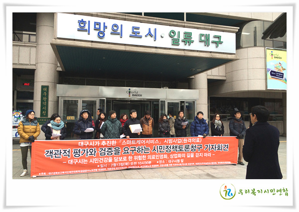 ³³¼¼ÀÚÀÎ ´ë±¸½Ã¹ÎÀÌ ¾Ë°íÀÚ ÇÏ´Â °ÍÀº ±â¾÷Á¤º¸°¡ ¾Æ´Ï¶ó À§ÀÇ ½Ã¹ü»ç¾÷ ÈÄ ¿ø°ÝÀÇ·áÀÇ »ó¿ëÈ °¡´É¼ºÀº ¾î´À Á¤µµ µÇ´ÂÁö, Âü¿© ½Ã¹Îµé°ú ÀÇ·á±â°üÀÇ ¸¸Á·µµ´Â ¾î´À Á¤µµ µÇ´ÂÁö µî Âü¿©±â¾÷°ú º´¿ø, ȯÀÚµéÀÇ Æò°¡´Ù. ±×·¯³ª ´ë±¸½Ã´Â »ç¾÷½ÃÀÛºÎÅÍ ³¡³¯ ¶§±îÁö ½Ã¹ÎµéÀ» ´ë»óÀ¸·Î °øÃ»È¸, Åä·Ðȸ Çѹø °³ÃÖÇÑ ÀûÀÌ ¾ø´Ù. ±¹Ã¥»ç¾÷À̶ó´Â ÀÌÀ¯¸¸À¸·Î ½Ã¹ÎµéÀÇ °Ç° µî »îÀÇ Áú °³¼±¿¡ Å« ¿µÇâÀ» ¹ÌÄ¥ ³»¿ëÀ» öÀúÈ÷ ºñ¹Ð¿¡ ºÎÄ¡´Â °ÍÀº ¾î¶² ÀÌÀ¯¶óµµ ÀûÀýÇÏ´Ù°í º¼ ¼ö ¾ø´Ù.