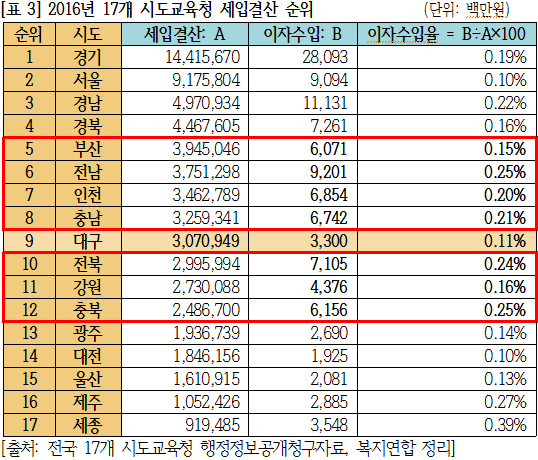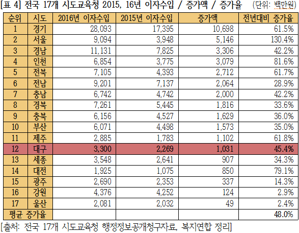 ¡á 17°³ ±³À°Ã» ¸ðµÎ Àü³â´ëºñ ÀÌÀÚ¼öÀÔÀÌ Áõ°¡ÇßÀ¸¸ç, Áõ°¡¾× ¼øÀ§·Î º¸¸é °æ±â±³À°Ã»(107¾ï/61.5%), ¼¿ï±³À°Ã»(51¾ï/130.4%), °æ³²±³À°Ã»(33¾ï/42.2%), ÀÎõ±³À°Ã»(31¾ï/81.6%), ÀüºÏ±³À°Ã»(27¾ï/61.7%)¼øÀ¸·Î Àü³â´ëºñ ÀÌÀÚ¼öÀÔÀÌ ¸¹°í, ´ë±¸±³À°Ã»Àº 12À§(10¾ï/45.4%)¸¦ Â÷Áö. Áõ°¡À²·Î´Â Àü±¹ 7À§Áö¸¸ Àü±¹Æò±Õ 48.0%º¸´Ù ³·À½. ¡á ´ë±¸½Ã±³À°Ã»ÀÌ º¸µµÀÚ·á¿¡¼ ¹àÈù °è»ê¹æ¹ýÀ¸·Î ÇØµµ Àü±¹ÀÇ ÇÏÀ§±Ç. ¡á °á±¹ ´ë±¸½Ã±³À°Ã»Àº Àü±¹ 17°³ ½Ãµµ±³À°Ã» Áß ÀÌÀÚ¼öÀÔÀ²ÀÌ 15À§ÀÎ °ÍÀ» ±³¹¦È÷ °¨Ãß±â À§ÇØ ´ë±¸½Ã±³À°Ã» 2015³â, 16³â ÀÚ·á·Î¸¸ Áõ°¡¾×, Áõ°¡À²À» °è»êÇÏ¿© º¸µµÀڷḦ ¹ßÇ¥. ±×·¯¸é¼ ´ë±¸½Ã±³À°Ã»¸¸ ¿¹»ê°ü¸®¸¦ ÀßÇÏ¿© ÀÌÀÚ¼öÀÔÀ» ¿Ã¶ó°£ µí º¸µµÀڷḦ ¹èÆ÷ÇÏ´Â ²Ä¼ö¸¦ ºÎ¸².