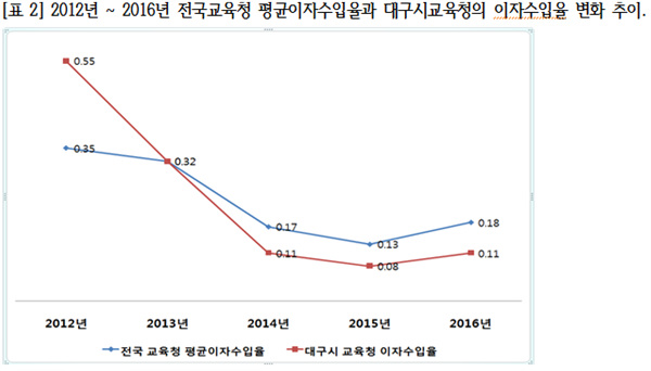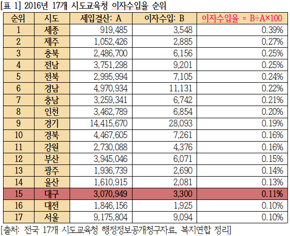 3. ´ë±¸½Ã±³À°Ã»ÀÇ ÀÚÈÀÚÂù ²Ä¼ö º¸µµÀÇ ½Çü. ¡á ´ë±¸½Ã±³À°Ã»Àº Áö³ 6¿ù 9ÀÏ(±Ý) 2016³â °á»ê¿¡¼ 15³âº¸´Ù 45.4%°¡ Áõ°¡ÇÑ 10¾ï 3,100¸¸ ¿øÀÇ Ãß°¡ÀÌÀÚ¼öÀÔÀ» ¿Ã·È´Ù¸ç º¸µµÀÚ·á ¹èÆ÷. [÷ºÎÀÚ·á 1. ÂüÁ¶] ¡á ÀÌ °°Àº ¼º°ú´Â ¡®½ÃÁß ±âÁرݸ®°¡ ÀÎÇϵǰí, ´ë±¸½Ã ¹ýÁ¤ÀüÀÔ±ÝÀ» ¿¬¸»¿¡ ¹Þ´Â µî ÀÌÀÚ¼öÀÔ Áõ´ë°¡ ¾î·Á¿î ¿©°Ç¿¡¼ ÀÚ±ÝÀÇ Ã¼°èÀû ÆÄ¾Ç, ÇÕ¸®ÀûÀÎ ÁýÇà, Á¤±â¿¹±Ý ¿¹Ä¡¸¦ È®´ëÇÏ´Â µîÀÇ ÀÚü³ë·ÂÀÇ °á°ú¡¯¶ó°í ÀÚÆò. ¡á ±×·¸´Ù¸é ´ë±¸¸¦ Á¦¿ÜÇÑ 16°³ ½Ãµµ±³À°Ã»ÀÇ ÀÌÀÚ¼öÀÔÀº ¾î¶³±î? Àü±¹ 17°³ ½Ãµµ±³À°Ã» °á»êÀڷḦ ´ë±¸½Ã±³À°Ã»ÀÇ °è»ê¹ýÀ¸·Î Á¤¸®ÇÏ¸é ¾Æ·¡ [Ç¥ 4]¿Í °°À½.
