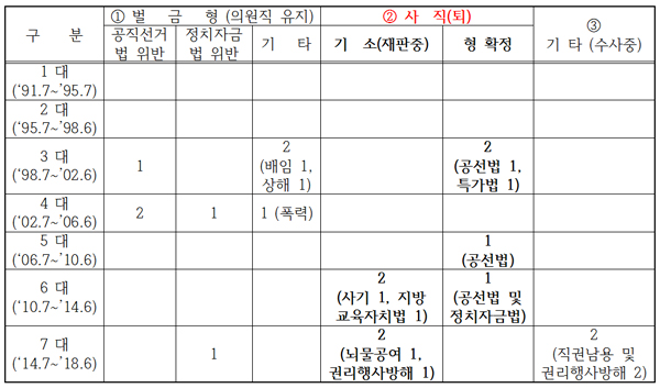 ¡Ø »çÁ÷(Åð) ÇöȲÀº ÀÇ¿øÁ÷ »çÁ÷(Åð) ½ÃÁ¡ÀÇ »çÀ¯¿Í ÀçÆÇ ÃßÁø»óȲÀ» ±â·Ï ´ë±¸½ÃÀÇȸ´Â ÇöÀç ¼ö»ç ÁßÀÎ 7´ë ½ÃÀÇ¿ø 2¸íÀ» ¨é±âŸ(¼ö»ç Áß)·Î ºÐ·ùÇß°í, 6´ë ½ÃÀÇ¿ø Áß ±â¼Ò(ÀçÆÇ Áß)À¸·Î ºÐ·ùÇÑ 2¸íÀº ´ç½Ã ±âÁØÀ¸·Î »çÅðÇÏ´Ù º¸´Ï Çü È®Á¤À» È®ÀÎÇÒ ¼ö ¾ø¾ú´Ù°í ÇØ¸íÇß´Ù. 1991³â 7¿ù ÃÊ´ë ´ë±¸½ÃÀÇȸ°¡ ±¸¼ºµÈ ÀÌÈÄ ºñ¸®·Î ÀÎÇØ »çÁ÷(Åð)ÇÑ ½ÃÀÇ¿øÀº ÃÑ 8¸íÀ̰í, ÀÇ¿øÁ÷Àº À¯ÁöÇßÀ¸³ª ¹ú±ÝÇüÀ» ¹ÞÀº ½ÃÀÇ¿øµµ 8¸íÀÌ´Ù. Á÷±Ç³²¿ë µîÀÇ ÇøÀÇ·Î 2¸íÀº ÇöÀç ¼ö»ç ÁßÀÌ´Ï, ºñ¸®·Î ¿¬·çµÈ ÀÇ¿øÀº ÃÑ 18¸íÀ̳ª µÈ´Ù. ƯÈ÷ ÇöÀç 7´ë ´ë±¸½ÃÀÇȸ´Â ÃÑ 5¸í(»çÅð 2¸í, ÀÇ¿øÁ÷ À¯Áö ¹ú±ÝÇü 1¸í, ¼ö»ç Áß 2¸í)ÀÌ ºñ¸®¿¡ ¿¬·çµÇ¾î ÀÖ¾î ½É°¢ÇÑ »óȲÀÌ´Ù(3´ë¿¡µµ ÃÑ 5¸í). ¹Ý¸é 1´ë¿Í 2´ë´Â ºñ¸®¿¬·ç ½ÃÀÇ¿øÀÌ ¾ø¾ú´Ù. ½ÃÀÇ¿øµéÀÇ »çÅð »çÀ¯·Î´Â °øÁ÷¼±°Å¹ý À§¹ÝÀ¸·Î ¹ú±Ý 100¸¸¿ø ÀÌ»óÀ» ¹ÞÀº °æ¿ì¿Í ³ú¹°°ú °ü·ÃµÈ °æ¿ì°¡ °¢°¢ 3¸íÀ¸·Î ´ëºÎºÐÀ» Â÷ÁöÇϰí ÀÖ´Ù. ¹Ý¸é °øÁ÷¼±°Å¹ý À§¹ÝÀÌÁö¸¸ 100¸¸¿ø ¹Ì¸¸ÀÇ ¹ú±ÝÀ» ¹Þ¾Æ ÀÇ¿øÁ÷À» À¯ÁöÇÑ °æ¿ì´Â ÃÑ 8¸í Áß 3¸íÀÌ´Ù. Áö¹æÀÇȸ´Â Áö¹æÀÚÄ¡¿Í Ç®»Ñ¸® ¹ÎÁÖÁÖÀÇÀÇ ²ÉÀ̶ó°í ¸»ÇÑ´Ù. ±×·¯³ª ´ë±¸½ÃÀÇȸ´Â ÁֹδëÇ¥±â±¸·Î¼ÀÇ À§»ó°ú ¿ªÇÒ, ÁýÇàºÎÀÇ °ßÁ¦¿Í °¨½Ã±â°üÀ¸·Î¼ÀÇ ¿ªÇÒº¸´Ù ¹«´É°ú ºñ¸®·Î ¾ó·èÁ® ÀÚÁ¤´É·ÂÀ» »ó½ÇÇϰí ÀÖÀ½À» ¶Ç ÇÑ ¹ø È®ÀÎÇÑ ¼ÀÀÌ´Ù. Áö¹æºÐ±ÇȰ¡ ÁøÇàµÉ¼ö·Ï Áö¹æÁ¤ºÎÀÇ ±ÇÇÑÀÌ Áõ°¡Çϰí, Áö¹æÁ¤ºÎ°¡ ´ã´çÇØ¾ß ÇÒ »ç¹«°¡ ¸¹¾ÆÁ® ÀÇȸÀÇ ¿ªÇÒÀº ´õ¿í Áõ´ëµÉ ¼ö¹Û¿¡ ¾øÁö¸¸, ´ë±¸½ÃÀÇȸÀÇ °è¼ÓµÈ ¿ªÁÖÇàÀº ½ÃÀÇȸÀÇ ºÒ½ÅÀ» Ű¿ì°í ÀÖ´Ù. µû¶ó¼ ¿ì¸®º¹Áö½Ã¹Î¿¬ÇÕÀº ´ë±¸½ÃÀÇȸ°¡ ºÒ¹ý¡¤ºñ¸®¿¡ ¿¬·çµÈ ÇÔ·® ¹Ì´Þ ÀÇ¿øÀ» ÅðÃâ½ÃŰ´Â µî °·ÂÇÑ Á¦Àç¹æ¾ÈÀ» ¸¶·ÃÇÒ °Í°ú ºÒ¹ý¡¤ºñ¸® ¿¬·ç ÀÇ¿øÀÇ ¼Ò¼Ó Á¤´çÀÌ Ãâ´çÀ» Æ÷ÇÔÇÑ °·ÂÇÑ Â¡°è¸¦ ÅëÇØ Ã¥ÀÓ ÀÖ´Â ¸ð½ÀÀ» º¸ÀÏ °ÍÀ» °·ÂÈ÷ Ã˱¸ÇÑ´Ù. ´Ù°¡¿À´Â 2018³â Áö¹æ¼±°Å¿¡´Â À¯±ÇÀÚµéÀÌ ºñ¸®¸¦ ÀúÁö¸£°í Áö¿ªÁֹεéÀÇ Àǻ翡 ¹ÝÇÑ ºÎÁ¤ÇÑ ÇàÀ§¸¦ ÇÑ Á¤Ä¡ÀÎÀ» Ç¥¸¦ ÅëÇØ Á¤Ä¡ÆÇ¿¡ ¹ßÀ» ¸ø ºÙÀÌ°Ô ÅðÃâ½ÃÄÑ¾ß ÇÒ °ÍÀÌ´Ù. 2017³â 6¿ù 28ÀÏ