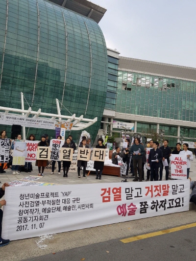°Ë¿ ¸»°í, °ÅÁþ¸» ¸»°í, ¿¹¼ú ÂÍ ÇÏÀÚ°í¿ä! ´ë±¸±¤¿ª½Ã°¡ ÁÖÃÖÇÏ°í ¡®(»ç)Çѱ¹¹Ì¼úÇùȸ ´ë±¸±¤¿ª½ÃÁöȸ¡¯(¾àĪ: ´ë±¸¹ÌÇù)°¡ ÁÖ°üÇÏ´Â ¡®Ã»³â¹Ì¼úÇÁ·ÎÁ§Æ® YAP¡¯°¡ Àü½Ã¸¦ 3ÁÖ ¾ÕµÐ ½ÃÁ¡¿¡ »çµå, ¼¼¿ùÈ£, ¹ÚÁ¤Èñ µîÀ» ¼ÒÀç·Î ÇÑ ÀÛǰ¿¡ ´ëÇØ »çȸÀû Ç¥ÇöÀ» ¹®Á¦ »ï¾Æ ¼öÁ¤°ú ±³Ã¼¸¦ ¿ä±¸Çß´Ù. ¾àÁ¤À» ü°áÇÏ°í ¼øÁ¶·Ó°Ô Àü½Ã¸¦ ÁغñÇÏ´ø ÀÛ°¡µéÀº ÀÌÇØÇÒ ¼ö ¾ø´Â ¿ä±¸¿¡ Å©°Ô ¹Ý¹ßÇÏ¿© Àü½Ã¸¦ º¸ÀÌÄàÇϰí ÀÔÀå¹®À» ¹ßÇ¥ÇÏ¿´°í, Çù·Â Å¥·¹ÀÌÅͱîÁö »çÅðÇÏ´Â ¾ÈŸ±î¿î ÀÏÀÌ ¹ú¾îÁ³´Ù. ±×·¯³ª ´ë±¸½Ã¿Í ´ë±¸¹ÌÇùÀº ´ëåȸÀǸ¦ °³ÃÖÇϰųª °ø½ÄÀûÀÎ ´ëÀÀÀ» ÀÏÀý ÇÏÁö ¾Ê¾Ò´Ù. ¿ÀÈ÷·Á ÀÌÅ»ÇÏÁö ¾ÊÀº ÀÛ°¡µéÀÇ ´Ü¼Ó¿¡ ¸ÅÁøÇϸç Àü½Ã¸¦ °ÇàÇÏ¿´°í, ¾ð·ÐÀ» ÇâÇØ º¯¸í°ú °ÅÁþ¸», Ã¥ÀÓÀü°¡·Î ÀϰüÇϸç ÇöÀç¿¡ À̸£·¶´Ù. ÀÌ¿¡ YAP Àü½Ã¸¦ Àü¸é º¸ÀÌÄàÇÑ ÀÛ°¡, Àü½Ã¿¡ Âü¿©ÇÏÁö¸¸ °Ë¿¿¡ ¹®Á¦Á¦±â¸¦ ÇÏ´Â ÀÛ°¡, °Ë¿»çÅ¿¡ ´ëÇØ ½É°¢ÇÑ ¹®Á¦ÀνÄÀ» °øÀ¯Çϰí ÀÖ´Â ¿¹¼ú´Üü¿Í ¿¹¼ú°¡ °³ÀÎ, ½Ã¹Î´Üü¿Í ¿¹¼úÇâÀ¯ÀÇ ±Ç¸®¸¦ °¡Áø ½Ã¹Îµé±îÁö Ç¥ÇöÀÇ ÀÚÀ¯ Ä§ÇØ¿Í û³â¿¹¼ú°¡¸¦ ÇâÇÑ °©ÁúÀÇ ½É°¢¼ºÀ» °æ°íÇϱâ À§ÇØ Àü½ÃȸÀÇ °³¸·À» ¾ÕµÐ ¿À´Ã ÀÌ ÀÚ¸®¿¡ ¼¹´Ù. ¡®2017û³â¹Ì¼úÇÁ·ÎÁ§Æ® YAP¡¯ÀÇ Ã¹ ¹øÂ° ¹®Á¦´Â °Ë¿ÀÇ ½É°¢¼ºÀ» ÀÎÁöÇÏÁö ¸øÇÑ´Ù´Â Á¡ÀÌ´Ù. ´ë±¸½Ã, ¹ÌÇù, Àü½Ã°¨µ¶ µîÀº ¸ðµÎ ¼øÈ, À¯È, ±Ç°í µîÀÇ ´Ü¾î¸¦ µ¿¿øÇÏ¿© °Ë¿ÀÌ ¾Æ´Ï¾ú´Ù°í ÁÖÀåÇϰí ÀÖ´Ù. ÀÛ°¡µéÀÇ ÀÛǰÀ» ¡®½´ÆÛ°©¡¯ÀÇ À§Ä¡¿¡ ÀÖ´Â Á¶Á÷À§¿¡¼ Á¤Ä¡ÀûÀ¸·Î ¹Î°¨ÇÑ ³»¿ëÀ» ¡®¼øÈ¡¯ ¶Ç´Â ¡®À¯È¡¯Ç϶ó°í ¡®±Ç°í¡¯ÇÏ¸é ½Ç¹«´ÜÀ§¿¡ À̸£·¯¼± °á±¹ ±× ÀÛǰÀº ¸¸½ÅâÀ̰¡ µÇ°Å³ª ÂѰܳª°Ô µÈ´Ù. ÀÌó·³ ±Ç·ÂÀ» °¡Áø Àڵ鿡°Ô °Ë¿Àº ´Ù¸¥ À̸§À¸·Î µ¡Ä¥µÇ¾î ÀÚÇàµÇ¸ç, ÀÛ°¡µéÀÇ Ç¥ÇöÀÇ ÀÚÀ¯°¡ ¼Õ½±°Ô ¾ï¾ÐµÈ Çö½ÇÀº Áö³ Á¤±ÇÀ» ¹«³ÊÁö°Ô ¸¸µç ¡®ºí·¢¸®½ºÆ® ÆÄ¹®¡¯ÀÇ ÇÑ ´Ü¸éÀÌ´Ù. µÎ ¹øÂ° ¹®Á¦´Â û³âÀÛ°¡µéÀÇ Á¤´çÇÑ ¹®Á¦Á¦±â¿¡ ´ëÇØ Áø»óÀ» ÆÄ¾ÇÇÏ·ÁÇϰí ÇØ°áÀ» ÇÏ·Á´Â ÀÇÁöµµ, ŵµµµ ã¾Æº¼ ¼ö ¾ø´Ù´Â °ÍÀÌ´Ù. ¹®Á¦°¡ Á¦±âµÇÀÚ ´ë±¸½Ã´Â Á¶Á÷À§¿¡°Ô, Á¶Á÷À§´Â ¹ÌÇù¿¡°Ô, ¹ÌÇùÀº Àü½Ã°¨µ¶¿¡°Ô, Àü½Ã°¨µ¶Àº Çù·ÂÅ¥·¹ÀÌÅÍ¿¡°Ô ÁÙÁÙÀÌ Ã¥ÀÓÀ» Àü°¡Çϰí ÀÖ´Ù. ¾Õ¼ ¡®±Ç°í°Ë¿¡¯ÀÌ ´Ù·ïÁø Á¶Á÷À§È¸ÀÇ¿Í ¡®°Ë¿½ÇÇà¹æ¹ý¡¯À» ³íÀÇÇß´ø ½Ç¹«È¸ÀÇ¿¡´Â ´ë±¸½Ã, ¹ÌÇù, Àü½Ã°¨µ¶, Å¥·¹ÀÌÅͰ¡ ¸ðµÎ Âü¼®ÇÏ¿© °¢ÀÚÀÇ ±¸Ã¼Àû ÀǰßÀ» °³ÁøÇß´Ù. ±×·¯³ª ¹®Á¦°¡ ¹ß»ýÇÏÀÚ ¸ðµÎ°¡ Á¦3ÀÚ°¡ µÇ¾î¹ö¸®´Â ±âÇö»óÀ» ¿ì¸®´Â ¾î¶»°Ô ÀÌÇØÇØ¾ß Çϴ°¡? °ü¸®°¨µ¶Çϰųª Ã¥ÀÓÁ®¾ßÇÒ ºÎºÐÀº ¸ðµÎ ȸÇÇÇØ ¹ö¸®°í, Ç¥ÇöÀÇ ÀÚÀ¯¸¦ º¸ÀåÇØ¾ßÇÒ ¿µ¿ªÀº °ú°¨ÇÏ°Ô °Çµå¸®´Â YAPÀÇ Á¶Á÷ü°è¾ß ¸»·Î ¸ÕÀú ½Ã¹ÎµéÀÇ °Ë¿´ë¿¡ ¿Ã¶ó¾ß ÇÒ °ÍÀÌ´Ù. ¼¼ ¹øÂ°·Î °ÅÁþ ÇØ¸í°ú º¯¸íÀ» ´õ ÀÌ»ó ÂüÀ» ¼ö ¾øÀ½À» °æ°íÇÑ´Ù. ÇùÂù±îÁö ¹Þ¾Æ Àü½Ã¸¦ ÃßÁøÇÏ´ø ÀÛǰ¿¡ ´ëÇØ »ó¾÷¿µÈ¶ó¼ Á¦¿ÜÇߴٰųª, ÃâǰÀÛÀÌ ¸¹¾Æ¼ ¹ÚÁ¤Èñ¸¦ ´àÀº ÀÛǰÀ» ÄÛ Âï¾î¼ Á¦¿Ü½ÃÄ״ٰųª, ¹®ÀåÀÌ ±æ¾î¼ ÁÙÀÌ¸é¼ ¼¼¿ùÈ£ ¶ó´Â ´Ü¾î¸¦ Áö¿ì¶ó°í Çß´Ù´Â µîÀÇ °ÅÁþÇØ¸íÀÌ ¿ì¸®µéÀÇ ºÐ³ë¿¡ ±â¸§À» µéÀ̺״ °ÝÀÌ´Ù. ¿ì¸®´Â ±Ùº»ÀûÀÎ ¹®Á¦¿¡ ´ëÇØ Áø»óÀ» ÆÄ¾ÇÇϰí Á¦´ë·Î ÇØ°áÇÏ·Á´Â ³ë·ÂÀ» ÇØ´Þ¶ó°í ÀϰüµÇ°Ô À̾߱âÇØ¿ÔÀ¸³ª YAPÀÇ ´ëÀÀÀº ´«¾ÕÀÇ ¹®Á¦¸¦ ¹«¸¶Çϱâ À§ÇØ È£¹Ì·Î ¸·À» ÀÏÀ» °¡·¡·Î, ¾Æ´Ï Æ÷Å©·¹ÀÎÀ¸·Îµµ ¸·Áöµµ ¸øÇÒ Á¤µµ·Î Ű¿ö´ë°í ÀÖ´Ù. ¿¹¼ú°è ³»¿¡ ¾ÈÁ¤ÀûÀ¸·Î ¾ÈÂøÇÏÁö ¸øÇÑ ¡®Ã»³â¿¹¼ú°¡¡¯µéÀº ÀÚ½ÅÀÇ ÀÛǰÀ» ´ëÁß¿¡°Ô º¸¿©ÁÙ ±âȸ¿¡ ¸ñ¸¶¸£°í, ÇàÁ¤°ú ±â¼º¿¹¼ú°èÀÇ °Å´ëÇÑ ±Ç·Â¿¬´ë ¾Õ¿¡¼ ÀÛ¾ÆÁú ¼ö¹Û¿¡ ¾ø´Ù. ¡®Ã»³â¡¯À» Àü¸é¿¡ ³»°É°í û³â¿¹¼ú°¡µéÀÇ Ãë¾àÇÑ Á¡À» ÆÄ°íµé¾î Ç¥ÇöÀÇ ÀÚÀ¯¸¦ ¾ï¾ÐÇÏ´Â ÀÌ ¾îÀ̾ø´Â ÇàÅ¿¡, ¿ì¸®´Â ´õ¿í ºÐ³ëÇÑ´Ù. ¿ì¸®´Â ÀÌ »çŰ¡ Áö³ Á¤±ÇÀÇ ºí·¢¸®½ºÆ®ÀÇ ¿¬Àå¼±»ó¿¡ ÀÖ´Ù°í »ý°¢ÇÏ¿© ¡®ºí·¢¸®½ºÆ® Áø»óÁ¶»çÀ§¿øÈ¸¡¯¿¡ »ç°ÇÀ» Á¦º¸ÇÏ¿´°í, Áø»óÁ¶»çÀ§¿¡¼´Â º» »ç°ÇÀ» Á¤Ä¡Àû ¼ºÇâ¿¡ µû¸¥ Â÷º° ¹× ¹èÁ¦·Î °£ÁÖÇØ »çÀüÁ¶»ç¿¡ Âø¼öÇß´Ù. ´õºÒ¾î YAP Àü½Ã±â°£ µ¿¾È 1ÀÎ ½ÃÀ§¸¦ À̾°¡´Â µî ¿ì¸®°¡ ÇÒ ¼ö ÀÖ´Â ¸ðµç ¹æ¹ýÀ» µ¿¿øÇÏ¿© ¿¹¼ú°è ¾ÈÆÆÀ¸·Î »ç½ÇÀüÆÄ¿Í ¹®Á¦Á¦±â¸¦ À̾°¥ °
