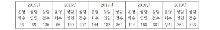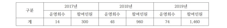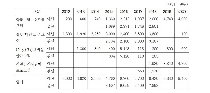 * 2019³â ÀÚ·á´Â 9¿ù¸» ±âÁØ, 2015³âºÎÅÍ 2019³â 9¿ù±îÁö ÇàÁ¤Á¤º¸Ã»±¸ÇÑ ÀÚ·á °á°ú <Ç¥5> ±Ù±äÀå¿ÏÈÇÁ·Î±×·¥ ÀÌ¿ëÀÚ ¼ö * 2019³â ÀÚ·á´Â 9¿ù¸» ±âÁØ, 2015³âºÎÅÍ 2019³â 9¿ù±îÁö ÇàÁ¤Á¤º¸Ã»±¸ÇÑ ÀÚ·á °á°ú <Ç¥4>¿¡¼ »ó´ãÁö¿øÇÁ·Î±×·¥ÀÇ ÀÌ¿ëÀÚ ¼ö´Â °è¼Ó Áõ°¡Çß´Ù. ¿¹»êÀº 2012³â 1,800¸¸¿øÀ¸·Î ½ÃÀÛÇØ 2018³â 3,600¸¸¿øÀ¸·Î Á¤Á¡À» Âï¾ú´Ù°¡ 2019³â ´ã´ç ÀÓ±âÁ¦ °ø¹«¿ø 1¸íÀ» »Ì¾Æ ¿î¿µÇϰí ÀÖ´Ù. 2017³â µµÀÔµÈ <Ç¥5>ÀÇ ±Ù±äÀå¿ÏÈÇÁ·Î±×·¥ ¿î¿µÈ¸¼ö¿Í ÀÌ¿ëÀÚ ¼öµµ ±ÞÁõÇß´Ù. ÀÌ¿¡ µû¶ó ¿¹»êÀº 2017³â 560¸¸¿øÀ» ½ÃÀÛÀ¸·Î 2018³â 1,920¸¸¿ø, 2019³â 3,840¸¸¿ø, 2020³â 4,700¸¸¿øÀ¸·Î °¡ÆÄ¸£°Ô »ó½ÂÇß´Ù. Åë°èÀûÀ¸·Î º¸¸é, ±Ù±äÀå¿ÏÈÇÁ·Î±×·¥Àº ´ë±¸½Ã °ø¹«¿ø¿¡°Ô »ó´çÇÑ ÀαⰡ ÀÖ¾î 2019³â ¸Å´Þ 7~9ȸ ¿î¿µ¿¡ 1ȸ Æò±Õ 20¸í, ¿ùÆò±Õ 140¸í~180¸íÀÌ ÀÌ¿ëÇß´Ù. ȸ´ç 40¸¸¿ø(2017, 2018³â Æò±Õ), °³Àδç 2¸¸¿ø ²ÃÀÌ´Ù. ¾àǰ ¹× ¼Ò¸ðǰ ±¸ÀÔÀº 2012³â 200¸¸¿ø¿¡¼ 2019³â 4,740¸¸¿øÀ¸·Î °¡Àå ¸¹¾Ò´Ù°¡ 2020³â 4,000¸¸¿øÀ» Æí¼ºÇØ 2012³â ´ëºñ 20¹è Áõ°¡Çß´Ù. µû¶ó¼ Áö±ÝÀº °Ç°°ü¸®½Ç ¿¹»êÀÇ ÀûÁ¤¼º À¯¹«¸¦ Á¡°ËÇÒ ½Ã±â´Ù. 4. Á¾ÇÕÀû Æò°¡ °ø¹«¿øµéÀÌ ¸¸¼ºÁúȯ°ú ½ºÆ®·¹½º¿¡ ½Ã´Þ¸± ¼ö ÀÖ°í, À̸¦ À§ÇØ ½Ãû ³» ¡®°Ç°°ü¸®½Ç¡¯À» µÑ ¼ö ÀÖ´Ù. ±×·¯³ª ¡®¼±Áøº¸°ÇÀǷἺñ½ºÁ¦°ø¡¯ À̶ó´Â Á¤Ã¥ÀÇ ¡®½Ã¹Î°Ç°¼öÁØÇâ»ó¡¯ ´ÜÀ§»ç¾÷¿¡ ¡®°Ç°°ü¸®½Ç¡¯À» ¿î¿µÇÏ´Â °ÍÀº º¸°Ç¿¹»êÀÇ »½Æ¢±âÀÌÀÚ ½Ã¹ÎÀ» ±â¸¸ÇÏ´Â ÇàÀ§·Î ºñÃçÁú ¼ö ÀÖ´Ù. Àü °ø¹«¿øÀ» »ó´ë·Î ¿î¿µÇÏ´Â »ç¾÷À» ½Ã¹Î°Ç°¿¹»ê Ç׸ñ¿¡ Æí¼ºÇÏ¿© º¸°Ç°Ç°°ú¿¡¼ ´ã´çÇÏ´Â °ÍÀº ±×·¡¼ ºÎÀûÀýÇÏ´Ù. Ãѹ«°ú¿¡¼ ÀηÂÀ» º°µµ·Î ä¿ëÇØ °Ç°°ü¸®½ÇÀ» ¿î¿µÇÒ Çʿ䰡 ÀÖ´Ù.