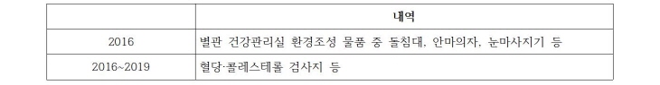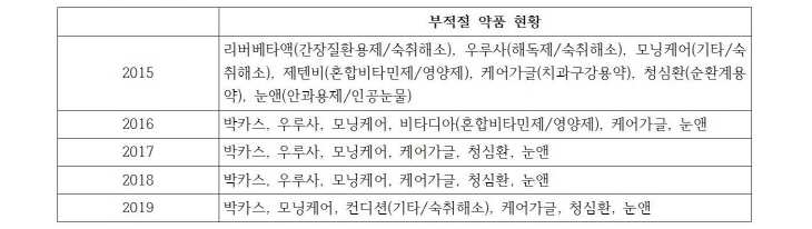 <Ç¥2>ÀÇ ³»¿ëÀº ºÎÀûÀýÇÏ´Ù°í ÆÇ´ÜµÇ´Â ¾àǰ ±¸¸Å ÇöȲÀÌ´Ù. °¢Á¾ ¼÷ÃëÀ½·á¿¡ ºñŸ¹Î, °¡±Û, û½Éȯ, ¹ÚÄ«½º±îÁö ±¸¸ÅÇÏ´Â °ÍÀº °Ç°°ü¸®½Ç ¿î¿µ ¸ñÀû¿¡ ÀüÇô ¸ÂÁö ¾Ê´Ù. <Ç¥3> ºÎÀûÀýÇÑ ¹°Ç°/¼Ò¸ðǰ ±¸ÀÔ ÇöȲ