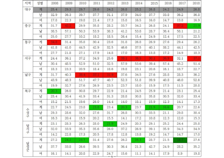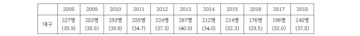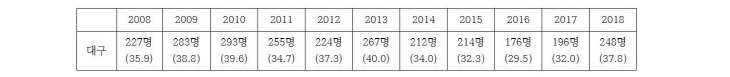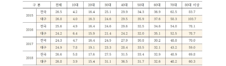 * Ãâó : Åë°èû »ç¸Á¿øÀÎÅë°è ¡Û Á¤ºÎµµ ÀÚ»ìÀÇ ½É°¢¼ºÀ» ÀÎÁöÇÏ°í °ü°èºÎó ÇÕµ¿À¸·Î ¡®Àڻ쿹¹æ ±¹°¡ Çൿ°èȹ¡¯(18~22³â) ¼ö¸³ÇÏ¿© 2022³â OECD ÀÚ»ì·ü 1À§ Å»ÇÇ ¸ñÇ¥·Î 6°³ ºÐ¾ß 54°³ °úÁ¦¸¦ Á¦½ÃÇϰí Àü´ãºÎ¼ÀÎ ¡®Àڻ쿹¹æÁ¤Ã¥°ú¡¯¸¦ ½Å¼³Çß´Ù(º¸°Çº¹ÁöºÎ º¸µµÀÚ·á, 2018.1.24.). ÀÌ °èȹ¿¡ ÀÇÇÏ¸é ¿ì¸®³ª¶ó ÀÚ»ì·ü(10¸¸¸í´ç) 25.6¸í(2016³â)À» 2022³â±îÁö 17.0¸íÀ¸·Î °¨¼Ò½ÃÄÑ OECD ÀÚ»ì·ü 1À§¶ó´Â ¿À¸íÀ» ¹þ°Ú´Ù´Â °ÍÀ̾ú´Ù. ´ç½Ã OECD Æò±Õ ÀÚ»ì·üÀº 12.1¸í(2017³â ¹ßÇ¥)À̾ú´Ù. ¡Û ÃÖ±Ù Á¤ºÎ´Â 2018³â ÀÚ»ì·üÀÌ ´Ù½Ã OECD 1À§·Î º¹±ÍÇÏÀÚ ¡®Àڻ쿹¹æ ±¹°¡ Çൿ°èȹ¡¯À» º¸¿ÏÇÏ¿© ´ëÃ¥À» Â÷Áú ¾øÀÌ ÃßÁøÇÏ°Ú´Ù°í ¹àÇû´Ù(º¸°Çº¹ÁöºÎ º¸µµÀÚ·á, 2019.9.24.). º¸°Çº¹ÁöºÎ´Â 2018³â ½É¸®ºÎ°Ë °á°úº¸°í¼¸¦ ÀοëÇÏ¿© ÀÚ»ì »ç¸ÁÀÚ 1ÀÎ´ç Æò±Õ 3.9°³ÀÇ »ý¾Ö ½ºÆ®·¹½º »ç°ÇÀÌ º¹ÇÕÀûÀ¸·Î ¿µÇâÀ» ¹ÌÃÆÀ¸¸ç Á¦µµÀû, »çȸÀû, °³ÀÎÀû ¿äÀÎÀÇ º¹ÇÕÀû ÀÛ¿ë °á°ú·Î ÇѵΠ°¡ÁöÀÇ ¿äÀθ¸À¸·Î Á¤È®ÇÑ ¼³¸íÀÌ ¾î·Æ´Ù°í ¹àÇû´Ù. ¡Û ÃÖ±Ù 11³â°£ ´ë±¸ÀÇ ÀÚ»ì·üÀº Àü±¹ Æò±Õ ÀÌÇÏ¿´À¸³ª À¯µ¶ 2015³â°ú 2018³âÀº Àü±¹ Æò±Õº¸´Ù ¾à°£ ³ô°Ô ³ª¿Ô´Ù. Àü±¹ 17°³ ½Ã¡¤µµ Áß 13À§, 7°³ Ư¡¤±¤¿ª½Ã Áß 5À§(2018³â »ç¸Á¿øÀÎÅë°è)Áö¸¸, ÀÚ»ì·ü ÀÚü°¡ ³Ê¹« ³ô±â ¶§¹®¿¡ ¼øÀ§´Â Å« Àǹ̸¦ ºÎ¿©Çϱâ Èûµé´Ù. µû¶ó¼ ´ë±¸½Ã¿Í 8°³ ±¸¡¤±ºÀº ÀÚ»ì·üÀ» ³·Ãß±â À§ÇØ ¸ðµç ÇàÁ¤·ÂÀ» µ¿¿øÇÏ¿© °øµ¿ ´ëÀÀ ¸¶·ÃÇÒ Çʿ䰡 ÀÖ´Ù. ¡Û Åë°èûÀÇ 2018³â »ç¸Á¿øÀÎÅë°èÀڷḦ º¸¸é, 2018³â 10´ë~30´ëÀÇ »ç¸Á¿øÀÎ 1À§´Â °íÀÇÀû ÀÚÇØ(ÀÚ»ì)À̸ç 40´ë, 50´ë¿¡¼ 2À§´Ù(1À§´Â ¾Ï). 10´ë 300¸í(10¸¸¸í´ç 5.8¸í), 20´ë 1,192¸í (10¸¸ ¸í´ç 17.6¸í), 30´ë 1,998¸í (10¸¸ ¸í´ç 27.5¸í)ÀÌ´Ù(Åë°èû, »ç¸Á¿øÀÎÅë°è). ÀÚ»ìÀº ³²¼º »ç¸Á¿øÀÎ 5À§, ¿©¼º »ç¸Á¿øÀÎ 8À§´Ù(Æó·Å Æ÷ÇÔ).