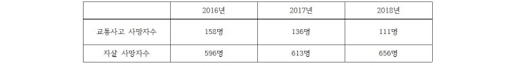 1) ´ë±¸ÀÇ ÀÚ»ìÀÚ ¼ö´Â ´ë±¸½Ã ±³Åë»ç°í »ç¸ÁÀÚÀÇ 6¹è, ÀÚ»ì 30% ÁÙÀ̱⠿Àº ¿Ö ¾ÈÇϳª? ¡Û Àü±¹Àû Åë°è·Î º¸¸é ÀÚ»ìÀº ±³Åë»ç°í »ç¸Á·üÀÇ 3¹è´Ù. 2018³â »ç¸ÁÀÇ ¿ÜÀÎ »ç¸Á·üÀº ÀÚ»ì(26.6¸í), ¿î¼ö»ç°í(9.1¸í), Ãß¶ô»ç°í(5.2¸í) ¼øÀ¸·Î ³ô¾Ò´Âµ¥, ÀÚ»ìÀº ¿î¼ö»ç°íÀÇ ¾à 3¹è ÀÌ»ó ³ô¾Ò´Ù. Àü³â ´ëºñ ÀÚ»ì(9.5%), Áßµ¶»ç°í(4.4%)ÀÇ »ç¸Á·üÀº Áõ°¡ÇÏ¿´°í, ¿î¼ö»ç°í(-7.2%), ÀÍ»ç»ç°í(-4.9%), Ÿ»ì(-4.5%) µîÀÇ »ç¸Á·üÀº °¨¼ÒÇß´Ù(Åë°èû »ç¸Á¿øÀÎÅë°è). ¡Û ´ë±¸ÀÇ °æ¿ì, ÃÖ±Ù 3³âÀÇ ±³Åë»ç°ú »ç¸ÁÀÚ ¼ö¿Í ÀÚ»ì »ç¸ÁÀÚ ¼ö¸¦ ºñ±³ÇÏ¸é ¾öû³ Â÷À̸¦ º¸À̸ç, 2018³âÀÇ °æ¿ì ÀÚ»ìÀº ±³Åë»ç°í »ç¸ÁÀÚÀÇ ¾à 6¹è´Ù. <Ç¥2> ±³Åë»ç°í »ç¸ÁÀÚ ¼ö¿Í ÀÚ»ì »ç¸ÁÀÚ ¼ö ºñ±³