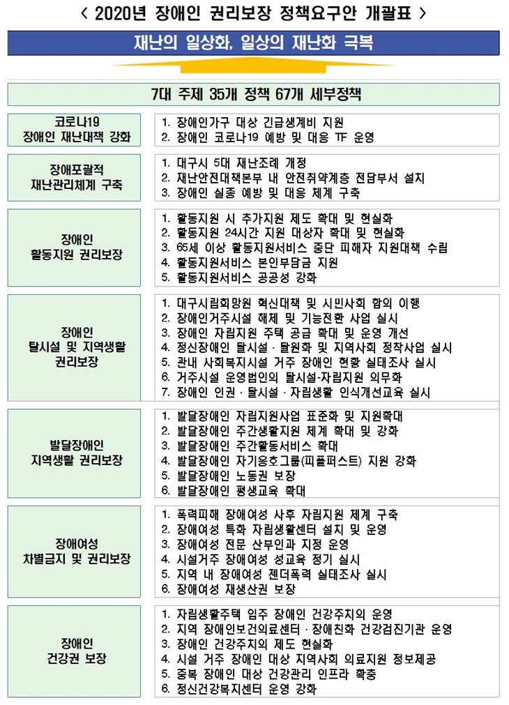 ´ë±¸½Ã ¿ª½Ã ¸¶Âù°¡Áö´Ù. Áß¾ÓÁ¤ºÎ¿¡¼ ½Ç½ÃÇÏ´Â ±¹°íº¸Á¶»ç¾÷¿¡ Æ÷ÇԵǾî ÀÖÁö ¾Ê°Å³ª, ±×°Í¸¸À¸·Î´Â ºÎÁ·ÇÏ¿© ÁöÀÚü°¡ Ãß°¡·Î º¸ÀåÇϰí ÀÖ´Â Á¦µµµéÀÌ Çϳª°°ÀÌ ÀÛµ¿À» ¸ØÃ߰ųª Á¦ ±â´ÉÀ» ÇÏÁö ¸øÇϰí ÀÖ´Ù. ±Ç¿µÁø ½ÃÀåÀÌ °ø¾àÇÑ 24½Ã°£ Ȱµ¿Áö¿ø´ë»óÀÚ È®´ë´Â 2019³â 21¸í ÀÌÈÄ ´õ ÀÌ»ó ÁøÇàµÇÁö ¾Ê¾ÒÀ¸¸ç, Ȱµ¿Áö¿ø ½ÃºñÁö¿ø Á¤Ã¥Àº Àå¾Öµî±ÞÁ¦ ÆóÁö·Î ÀÎÇÏ¿© ´ë»óÀÚ È®´ë°¡ ºÒ°¡ÇÇÇÔ¿¡µµ ºÒ±¸ÇÏ°í ¿¹»ê»óÀÇ ÀÌÀ¯·Î ´õ ÀÌ»óÀÇ ½Å±Ô ÀÌ¿ëÀÚ°¡ ´Ã¾î³ªÁö ¾Ê°í ÀÖ´Ù. ´õºÒ¾î ±¹°¡ÀαÇÀ§¿øÈ¸°¡ ±Ç¸®±¸Á¦¸¦ ±Ç°íÇÑ Áö¿ªÀÇ 65¼¼ ÀÌ»óÀÇ Àå¾ÖÀθ¸ ¿¬°£ 100¿©¸íÀÌ ³ª¿À°í ÀÖÁö¸¸ ÀÌ¿¡ ´ëÇØ¼µµ ´ë±¸½Ã´Â ¼Õ ³õ°í ÀÖ´Ù. Àå¾ÖÀÎ ÀÚ¸³»ýȰÁö¿øÁ¶·Ê¿¡ µû¶ó ¿¬³» ¼ö¸³µÇ¾î¾ß ÇÒ 2Â÷ Å»½Ã¼³ ÃßÁø°èȹÀº Áö±Ý±îÁöµµ ¸¸µé¾îÁöÁö ¾Ê°í ÀÖÀ¸¸ç, ¹ß´ÞÀå¾ÖÀÎ ±Ç¸®º¸ÀåÁ¶·Ê¿¡ µû¸¥ ¹ß´ÞÀå¾ÖÀÎ ±âº»°èȹÀº ÀÌ¹Ì 1³â Àü¿¡ °ü·Ã ¿¬±¸°¡ ³¡³µÀ½¿¡µµ ¹ßÇ¥¸¦ ¹Ì·ç°í ÀÖ´Ù. ÃÖ±Ù¿¡´Â 2017³â ´ë±¸½Ã¸³Èñ¸Á¿ø »çÅ ÀÌÈÄ ¼³Ä¡µÈ Å»½Ã¼³ ÀÚ¸³Áö¿øÆÀÀÇ Àοø¸¶Àú 3¸í¿¡¼ 2¸íÀ¸·Î Ãà¼ÒÇÏ¿© Àå¾ÖÀκ¹Áö°ú´Â Áö¿ª Àå¾ÖÀÎÀ» À§ÇÑ Å»½Ã¼³ ÀÚ¸³Áö¿ø Ã¥ÀÓÀ» µîÇѽÃÇß´Ù. ÀÌ´Â ¸ðµÎ ³»³âµµ ¿¹»ê ±äÃà°ú °ü·Ã ÀÖ´Ù. ´ë±¸½Ã´Â ³»³âµµ Àç·®»ç¾÷ÀÇ 50% ÀÌ»óÀÇ ±äÃàÀ» ¿¹°íÇϰí ÀÖ´Ù. Áö³ 8¿ù ¸» Àå¾ÖÀκ¹Áö°úÀåÀº ¸é´ãÀ» ÅëÇØ ³»³â ¿¹»êÀÌ ¿ÃÇØ ¿¹»ê ´ëºñ 55%°¡·® Ãà¼ÒµÇ¾î ¿¹»êºÎ¼·Î Á¦ÃâµÉ »óȲÀ̶ó¸ç Á¤Ã¥ ÇùÀÇ ÀÚü°¡ ¹«ÀǹÌÇÑ »óŶó°í ÀÎÁ¤ÇßÀ¸¸ç, ¿¹»ê½Ç °ü°èÀÚ ¿ª½Ã Àç·®»ç¾÷ÀÇ 50% ÀÌ»óÀ» °¨ÃàÇÏ´Â °ÍÀÌ ¸ñÇ¥¶ó°í ¾ð·Ð ÀÎÅͺ並 ÅëÇØ ¹àÇû´Ù. ÀÌ¿¡ ¿ì¸®´Â Áö³ 9¿ù Àå¾ÖÀκ¹Áö°ú¿Í ¿¹»ê´ã´ç°ü½ÇÀ» ÅëÇÏ¿© Àå¾ÖÀÎ ±Ç¸®º¸Àå ¼º°ÝÀÇ »ç¾÷¿¹»êÀº Çà»ç¼º ¿¹»êÀÌ ¾øÀ¸¸ç, ´ëºÎºÐ Àå¾ÖÀÎÀÇ »ýÁ¸±Ç°ú °ü·ÃµÈ ÀΰǺñ¼º ¿¹»ê, ¶Ç´Â Å»½Ã¼³°ú °°ÀÌ Á¤Ã¥±âÁ¶ÀÇ À¯Áö‧°È°¡ ÇÊ¿äÇÑ »ç¾ÈµéÀÓÀ» °Åµì ¹àÇû´Ù. ±×·¯³ª ¿¹»ê´ã´ç°ü½ÇÀº ¹Ý¿µÀ» À§ÇØ ³ë·ÂÇϰڴٴ ¿ø·ÐÀûÀÎ ´äº¯¸¸ ³»¾î³õ¾ÒÀ¸¸ç, ¼Ò°üºÎ¼ÀÎ Àå¾ÖÀκ¹Áö°ú´Â Àå¾ÖÀÎ »ýÁ¸±Ç Á¤Ã¥ÀÇ ¿ä±¸ ¹è°æ¿¡ ´ëÇÑ ÀÌÇØµµ Á¦´ë·Î ÇÏÁö ¾ÊÀº ä ¾î¶² Àû±ØÀûÀÎ ¸ð½Àµµ º¸ÀÌÁö ¾Ê°í ÀÖ´Ù. ¡®À¯»ç ½Ã À糡¯¿¡ ´ëÇÑ Åµµ´Â ¡®Æò»ó ½Ã À糡¯¿¡ ´ëÇÑ Åµµ¸¦ ¹Ý¿µÇÑ´Ù. Äڷγª19 ¹ß»ý Á÷ÈÄ Àå¾ÖÀΰ谡 °ü·Ã ´ëÃ¥¾ÈÀ» ¿ä±¸ÇÑ Áö ¹Ý³âÀÌ Áö³µ´Ù. ±×·¯³ª Á¤ºÎ¿Í ´ë±¸½Ã´Â ¸ðµÎ ÀçÀ¯Çà ´ëºñ °èȹ¿¡¼ ÀüÇô Àå¾ÖÀÎÀ» °í·ÁÇÏÁö ¾Ê°í ÀÖ´Ù. Àå¾ÖÀο¡°Ô ÀûÇÕÇÑ °¨¿°º´ ´ëÀÀ ¼¼ºÎ°èȹ°ú ¿¹»êÀ» Áö±Ý±îÁöµµ ¸¶·ÃÇÏÁö ¾Ê°í ÀÖ´Â °ÍÀÌ´Ù. Áö±ÝÀÇ Àç³À» ´Ù·ç´Â Á¤ºÎ¿Í ´ë±¸½ÃÀÇ ¹«Ã¥ÀÓÇÑ ¸ð½À¿¡¼ ¿ì¸®´Â Àå¾ÖÀÎÀÌ °Þ´Â ÀÏ»óÀÇ À糿¡ ¾ó¸¶³ª ±¹°¡°¡ ¹«°¨°¢ÇÑÁö ´Ù½Ã±Ý ´À³¤´Ù. ³ª¾Æ°¡ Áß¾ÓÁ¤ºÎ Â÷¿øÀÇ Á¦´ë·Î µÈ ¿¹»ê ¼ö¸³ÀÌ ÀÌ·ç¾îÁöÁö ¾ÊÀº °¡¿îµ¥, ´ë±¸½Ã°¡ Áö±ÝÀÇ °èȹ´ë·Î ³»³âµµ Àç·®»ç¾÷ ¿¹»êÀÇ 50% ÀÌ»óÀ» °¨ÃàÇÑ´Ù¸é Àå¾ÖÀΰú ±× °¡Á·ÀÇ ÀÏ»ó¿¡ ´õ Å« Àç³ÀÌ ´ÚÄ¥ °ÍÀº ³Ê¹«³ª ÀÚ¸íÇÑ ÀÏÀÌ´Ù. ´õºÒ¾î ÀÌ´Â ºñ´Ü Àå¾ÖÀθ¸ÀÌ ¾Æ´Ï¶ó Áö¿ª Àüü Ãë¾à°èÃþÀÇ Àç³ ÀÌÈÄ ºÒÆòµî ½Éȷεµ À̾îÁú °ÍÀÌ´Ù. ÀÌ¿¡ ¿À´Ã ¿ì¸®´Â ÀÌ ÀÚ¸®¿¡¼ ¹«±âÇÑ ½ÃÀ§¿¡ µ¹ÀÔÇÑ´Ù. ´ë±¸½Ã¿Í ½ÃÀÇȸ¸¦ ´ë»óÀ¸·Î ¿¹»ê ±äÃà ±âÁ¶ öȸ¿Í ³»³âµµ Àå¾ÖÀÎ »ýÁ¸±Ç ¿¹»êÀÇ È®´ë¸¦ ¿ä±¸ÇÑ´Ù. ´ë±¸½Ã´Â ´õ ÀÌ»ó Áß¾ÓÁ¤ºÎ¿Í Äڷγª19¸¦ ÇÎ°è »ï¾Æ Èû¾ø´Â À̵éÀÇ »îÀ», Àå¾ÖÀÎ »ýÁ¸±ÇÀ» Ãà¼ÒÇÏÁö ¸»¶ó. ¿ì¸®´Â ´ÙÀ½°ú °°ÀÌ ¿ä±¸ÇÑ´Ù. Çϳª, ¿¹»ê ±äÃà ¹Ý´ëÇÑ´Ù! 2021³â Àå¾ÖÀÎ ±Ç¸®º¸Àå ¿¹»ê Áï°¢ È®´ëÇ϶ó!