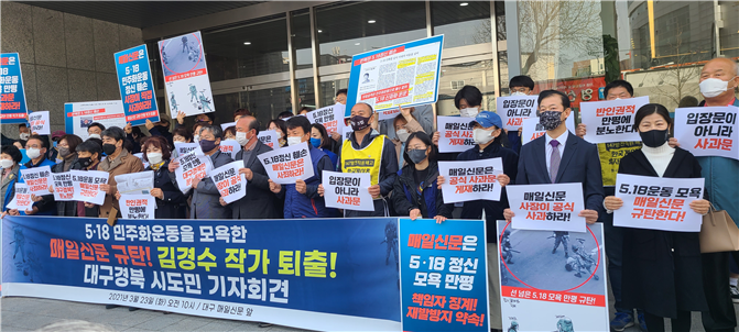 <°øµ¿ ±âÀÚȸ°ß¹®> 5¡¤18 ¹ÎÁÖȿ ¸ð¿åÇÑ ¸ÅÀϽŹ®Àº ±¹¹Î ¾Õ¿¡ °ø½Ä »çÁËÇ϶ó! ´ë±¸ Àϰ£ÁöÀÎ <¸ÅÀϽŹ®>Àº Áö³ 3¿ù 19ÀÏÀÚ '¸ÅÀÏÈñÆò'¿¡ °Çº¸·á¿Í Àç»ê¼¼, Á¾ºÎ¼¼·Î À̸§ ºÙ¿©Áø ¹«Àå ±ºÀεéÀÌ '9¾ï Ãʰú 1ÁÖÅÃÀÚ'¸¦ ¸ùµÕÀÌ·Î ¸¶±¸ ¶§¸®´Â ¸¸ÆòÀ» ½Ç¾ú´Ù. ÅäÁö°ø°³³äÀÌ ¾Æ´Ñ 'ÅäÁöµ¶Àç'¶ó¸ç ¹®ÀçÀÎ Á¤ºÎÀÇ ºÎµ¿»ê ´ëÃ¥À» ºñÆÇÇÏ´Â ³»¿ëÀ̾ú´Ù. ÀÌ´Â 5¡¤18¹ÎÁÖȿ ´ç½Ã °ø¼öºÎ´ë°¡ ¹«°íÇÑ ±¤ÁֽùÎÀ» °ïºÀÀ¸·Î ±¸Å¸ÇÏ´Â ½ÇÁ¦ »çÁøÀ» ±×´ë·Î º£³¤ °ÍÀ¸·Î ¹ÎÁÖȿÀ» ¸ð¿åÇϰí ÈñÈÈÇÑ ¹üÁ˼öÁØÀÇ ¹ÝÀαÇÀû ¸¸ÆòÀÌ´Ù. ¡®¾ð·ÐÀÇ ÀÚÀ¯¡¯µµ ±Ýµµ°¡ ÀÖ°í, ±âÁØÀÌ ÀÖ´Ù. À̹ø ¸ÅÀϽŹ®ÀÇ ¸¸ÆòÀº ¡®¾ð·ÐÀÇ ÀÚÀ¯¡¯¶ó´Â À̸§À¸·Î ÀÚÇàµÈ ¶Ç ´Ù¸¥ Æø·ÂÀÏ »Ó¸¸ ¾Æ´Ï¶ó ½É°¢ÇÑ ¼öÁØÀÇ ¹ÝÀαÇÀûÀ̸ç, ¹ÝÀ±¸®ÀûÀÎ ÇàÀ§ÀÌ´Ù. ´ë±¸ <¸ÅÀϽŹ®>Àº À̹ø ¸¸ÆòÀ» ÅëÇØ ±¤ÁֽùÎÀ» ÆøÇàÇϰí ÇлìÇÑ ÀüµÎȯ ±º»çµ¶ÀçÁ¤±ÇÀ» Çö Á¤ºÎ·Î ºñÀ¯ÇÔÀ¸·Î½á ÀÌ ¸¸ÆòÀ» º¸´Â À̵é·Î ÇÏ¿©±Ý ¸¶Ä¡ ÀڽŵéÀÌ Çö Á¤ºÎ¿¡ ÀÇÇØ °ú°Å ÀüµÎȯ ±ººÎÀÇ ÇϼöÀÎÀÌ´ø °ø¼öºÎ´ë¿¡°Ô Çлì´çÇÑ ±¤Áֽùεé°ú °°Àº ÇÇÇØÀÚÀÎ¾ç ¿Ö°îÇÏ¿´´Ù. ¹ÝÀαÇÀûÀ̰í, ¹ÝÀ±¸®ÀûÀÎ <¸ÅÀϽŹ®>ÀÇ À̹ø ¸¸ÆòÀº µµ´öÀû ¹®Á¦¸¦ ³Ñ¾î ¡¸5¡¤18¿ª»ç¿Ö°îƯº°¹ý¡¹(5.18¹ÎÁÖȿ µî¿¡ °üÇÑ Æ¯º°¹ý, ÀÌÇÏ ¡®5¡¤18Ưº°¹ý¡¯) À§¹Ý ¼ÒÁöµµ Á¦±âµÇ°í ÀÖ´Ù. 5¡¤18Ưº°¹ýÀº 5¡¤18¹ÎÁÖȿÀ» ºÎÀΡ¤ºñ¹æ¡¤¿Ö°î¡¤³¯Á¶ÇÒ °æ¿ì 5³â ÀÌÇÏÀÇ Â¡¿ª ¶Ç´Â 5õ¸¸ ¿ø ÀÌÇÏÀÇ ¹ú±Ý¿¡ óÇϵµ·Ï Çϰí ÀÖ´Ù. Áö¿ª À¯·Â¾ð·ÐÀÓÀ» ÀÚºÎÇÏ´Â ´ë±¸<¸ÅÀϽŹ®>ÀÌ 5¡¤18¹ÎÁÖȿÀ» ÆïÈÑÇÏ°í ¿Ö°îÇÑ À̹ø »ç°ÇÀº ´Ü¼øÇÑ ¸ð¿åÀ» ³Ñ¾î ÇöÇà¹ý À§¹ÝÀÇ ´ë»óÀÌ µÉ ¼ö ÀÖ´Ù. ±×·¯³ª <¸ÅÀϽŹ®>Àº ±¹¹Îµé°ú ´ë±¸°æºÏ ½Ã¡¤µµ¹ÎµéÀÇ ºÐ³ë¿Í ºñÆÇ¿¡µµ ºÒ±¸ÇÏ°í ¹Ý¼º¾ø´Â ÀÔÀå¹®¸¸ °ÔÀçÇÏ¿© ½Ãµµ¹Îµé¿¡°Ô ´õ¿í °øºÐÀ» »ç°í ÀÖ´Ù. ÀÌ´Â ±¹¹ÎµéÀ» ¶Ç´Ù½Ã ±â¸¸ÇÏ´Â ÇàÀ§·Î ¿ë¼¹ÞÀ» ¼ö ¾ø´Ù. ƯÈ÷, <¸ÅÀϽŹ®>ÀÇ 5¡¤18¹ÎÁÖȿ ¸ð¿å ÇàÀ§°¡ óÀ½ÀÌ ¾Æ´Ï¶ó´Â Á¡Àº ´õ¿í Ãæ°ÝÀûÀÌ´Ù. <¸ÅÀϽŹ®>Àº Áö³ÇØ, 8¿ù 23ÀÏ ¸ÅÀÏÈñÆòÀ» ÅëÇØ 'Ä£¹®' ¿ÏÀåÀ» µÎ¸¥ °è¾ö±ºÀÌ 8.15 Áýȸ¸¦ Çã¿ëÇÑ ¹ý¿øÀ» ¸ùµÕÀÌ·Î ³»¸®Ä¡´Â Àå¸éÀ» ´ãÀº ¸¸ÆòÀ» ½Ç¾î ³í¶õÀÌ µÈ ¹Ù ÀÖ´Ù. <¸ÅÀϽŹ®>Àº ÀÌ·± ¹ÝÀαÇÀûÀÎ ¸¸ÆòÀ» ½Æ°Ô µÈ °æÀ§¿Í ¸ñÀû¿¡ ´ëÇØ Áø»óÀ» ±Ô¸íÇϰí Áï°¢ ±¹¹Îµé°ú 5¡¤18¹ÎÁÖȿ ÇÇÇØÀÚ¿¡°Ô »ç°úÇØ¾ß ¸¶¶¥ÇÏ´Ù. ¿ì¸® ´ë±¸°æºÏ ½Ã¡¤µµ¹ÎµéÀº ´ÙÀ½°ú °°ÀÌ ¿ä±¸ÇÑ´Ù. - 5¡¤18¹ÎÁÖȿÀ» ¸ð¿åÇÑ ¸¸ÆòÀ» Á¦ÀÛ, °ÔÀçÇÑ <¸ÅÀϽŹ®>À» °·ÂÈ÷ ±ÔźÇÑ´Ù! - <¸ÅÀϽŹ®>Àº 5¡¤18¹ÎÁÖȿ ¸ð¿å¿¡ ´ëÇØ °ø½Ä »ç°ú¹®À» Àü¸é °Ô½ÃÇ϶ó! - <¸ÅÀϽŹ®> »çÀåÀº 5¡¤18¹ÎÁÖȿ Á¤½ÅÀ» ÈѼÕÇÑ Ã¥ÀÓÀ» Áö°í Á÷Á¢ »ç°úÇ϶ó! - <¸ÅÀϽŹ®>Àº ¹ÝÀαÇÀûÀÎ 5¡¤18¹ÎÁÖȿ ¸ð¿å ¸¸ÆòÀ» ±×¸° ±è°æ¼ö ÀÛ°¡¸¦ Áï°¢ ÅðÃâÇ϶ó! - 5¡¤18 ÆïÈÑ ¸¸ÆòÀ» Á÷Á¢ ±×¸° ±è°æ¼ö ÀÛ°¡´Â 5.18ÇÇÇØÀÚ¿Í ½Ã¹Îµé¿¡°Ô °ø½Ä »çÁËÇ϶ó! - <¸ÅÀϽŹ®>Àº À̹ø »ç°Ç¿¡ ´ëÇØ öÀúÈ÷ Áø»ó±Ô¸íÇÏ°í °ü·ÃÀÚ¿¡ ´ëÇØ ¡°è ¹× Àç¹ß¹æÁö ´ëÃ¥À» ¸¶·ÃÇ϶ó! 2021³â 3¿ù 23ÀÏ ±âÀÚȸ°ß Âü°¡ÀÚ Àϵ¿ <Âü°¡´Üü> 10¿ù¹®ÇÐȸ, 427ÇѹݵµÆòȹø¿µ½Ã¹ÎÀç´Ü´ë±¸°æºÏȸ, 5.18±¸¼ÓºÎ»óÀÚȸ´ë±¸°æºÏÁöºÎ, 6.15°øµ¿¼±¾ð½Çõ³²ÃøÀ§¿øÈ¸´ë±¸°æºÏº»ºÎ, °£µð¹®È¼¾ÅÍ, °³Çõ±¹¹Î¿¬Çվȵ¿¿µÁÖ±¹¹Î¿¬ÇÕ, °³Çõ±¹¹Î¿îµ¿º»ºÎ¿µ³²ÁöºÎ, °Ç°»çȸ¸¦À§ÇÑÄ¡°úÀÇ»çȸ´ë±¸°æºÏÁöºÎ, °Ç¼³³ëÁ¶´ë°æº»ºÎ, °Ü·¹ÅëÀϹ®È(»ç), °æºÏ´ë ¹ÎÁÖȱ³¼öÇùÀÇȸ, °æºÏ´ë70³â»çÁ¤»óȵ¿¹®½Ã¹Î¿¬´ë, °æºÏ´ëÇб³¹ÎÁÖµ¿¹®È¸, °æ»ê¸¶À»Çб³, °æ»ê¹ÎÁÖ´ÜüÇùÀÇȸ, °æ»ê½Ã¹Î¸ðÀÓ, °æÀÏ´ëÇб³¹ÎÁÖµ¿¿ìȸ, °æÁÖ°Ü·¹Çϳª, °æÁÖÆòÈ¿¬´ë, °è¸í´ëÇб³¹ÎÁÖµ¿¹®È¸, °ø°ø¿î¼ö³ëÁ¶´ë°æº»ºÎ, ±³¼ö³ëÁ¶´ë°æÁöºÎ, ±³À°°ø¹«Á÷º»ºÎ´ë±¸ÁöºÎ, ±³À°ÀûÆó±¹¸³´ë³ó´ÜÁø»ó±Ô¸í½Ã¹Î´ëÃ¥À§, ±Ý¼Ó³ëÁ¶´ë±¸ÁöºÎ, ±âº»¼Òµæ±¹¹Î¿îµ¿´ë°æ¿¬±¸È¸, ±âº»¼Òµæ´ç´ë±¸½Ã´ç, ±âº»¼Òµæ´ë±¸°æºÏÆ÷·³, ±ú¾îÀִ´뱸½Ã¹Îµé, ³ëµ¿´ç´ë±¸½Ã´ç, ³ëµ¿»çȸ°úÇבּ¸¼Ò ´ë±¸Áöȸ, ³ë¹«ÇöÀç´Ü Æ÷Ç×Áöȸ, ³ë¹«ÇöÀç´Ü´ë±¸°æºÏÁö¿ªÀ§¿øÈ¸ ³ë°øÀ̻ꎹæ´Ü, ³ì»ö´ç´ë±¸½Ã´ç, ´ë±¸°¡Å縯´ëÇб³ ¹ÎÁÖµ¿¹®È¸, ´ë±¸°æºÏ Àü¹®Á÷´ÜüÇùÀÇȸ, ´ë±¸°æºÏ°Ü·¹Çϳª, ´ë±¸°æºÏ´ëÇлýÁøº¸¿¬ÇÕ, ´ë±¸°æºÏ¸ñȸÀÚÁ¤ÀÇÆòÈÇùÀÇȸ, ´ë±¸°
