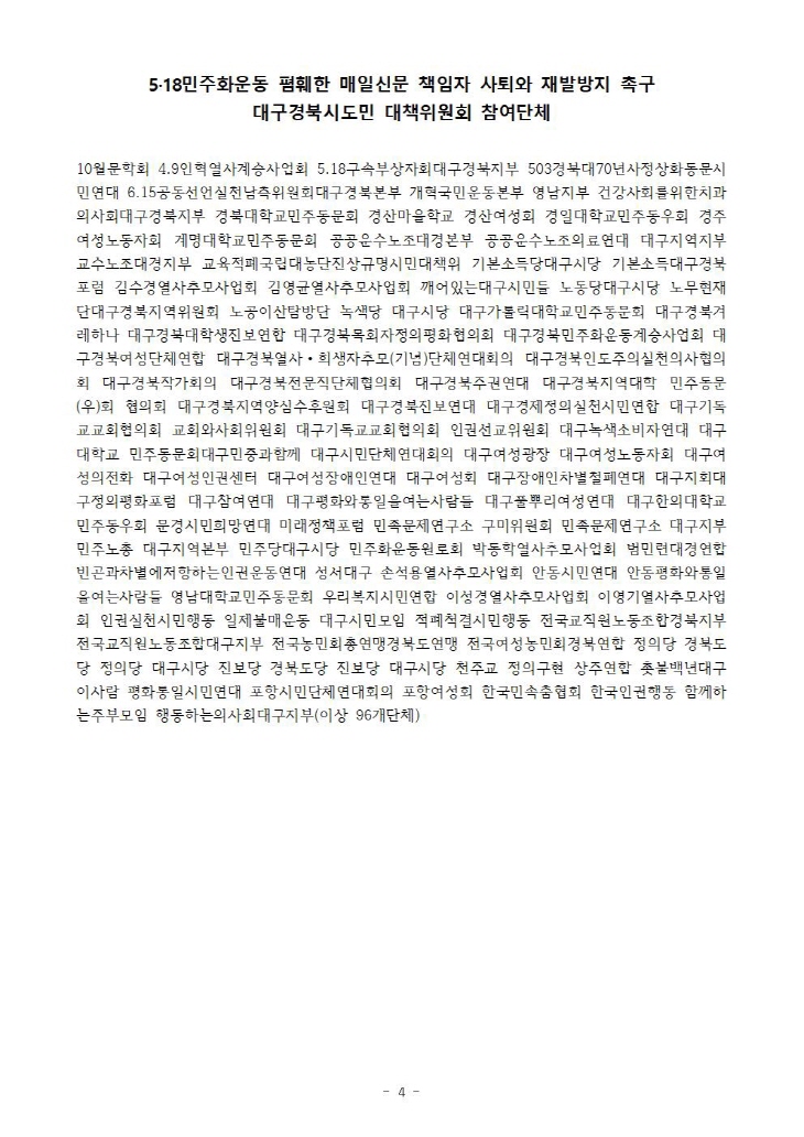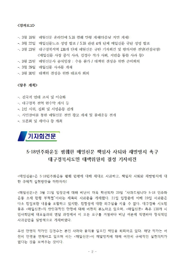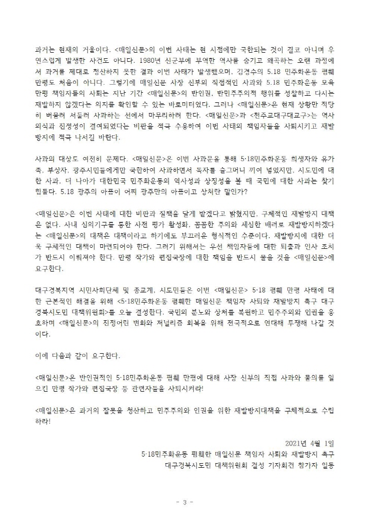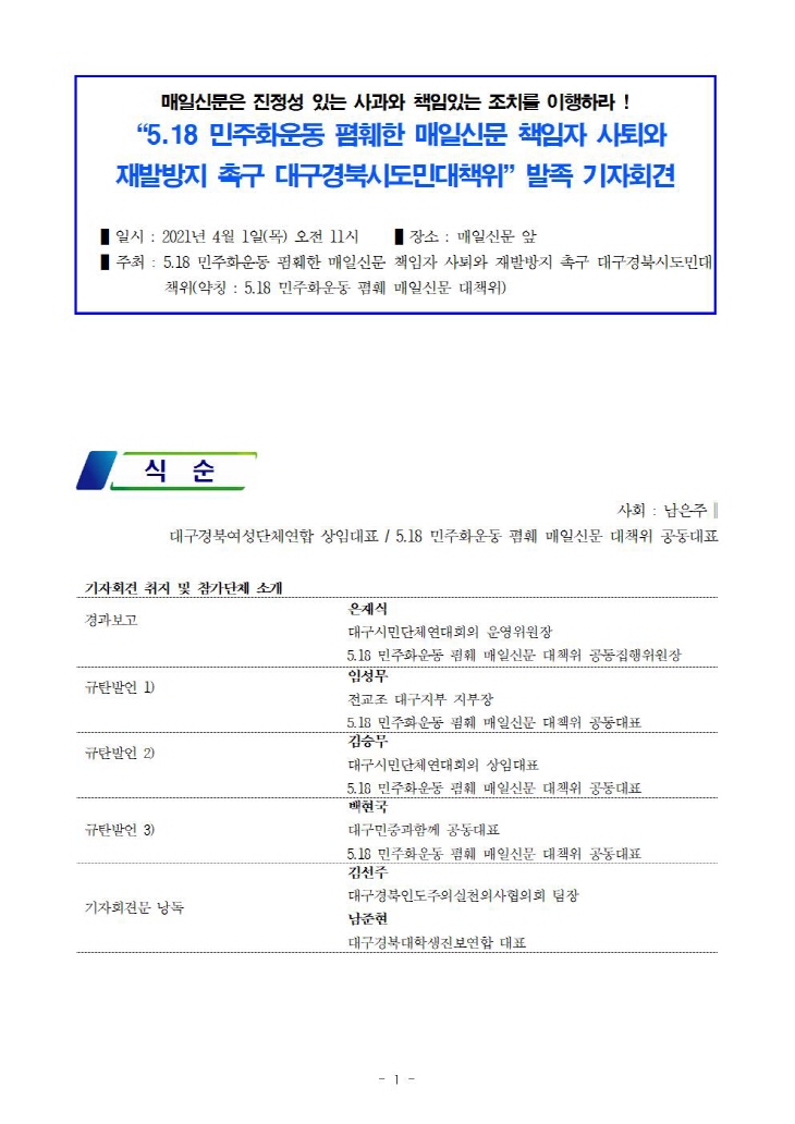 [±âÀÚȸ°ß] 5.18 ¹ÎÁÖȿ ÆïÈÑ ¸ÅÀϽŹ® ´ëÃ¥À§ ¹ßÁ· ±âÀÚȸ°ß